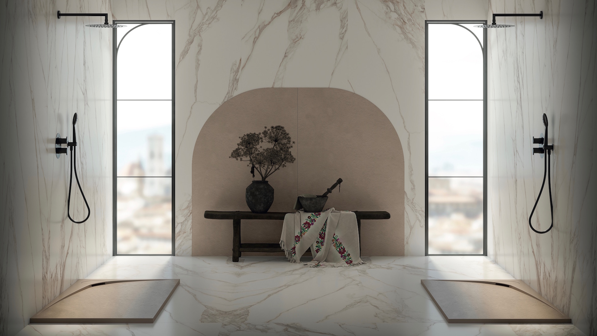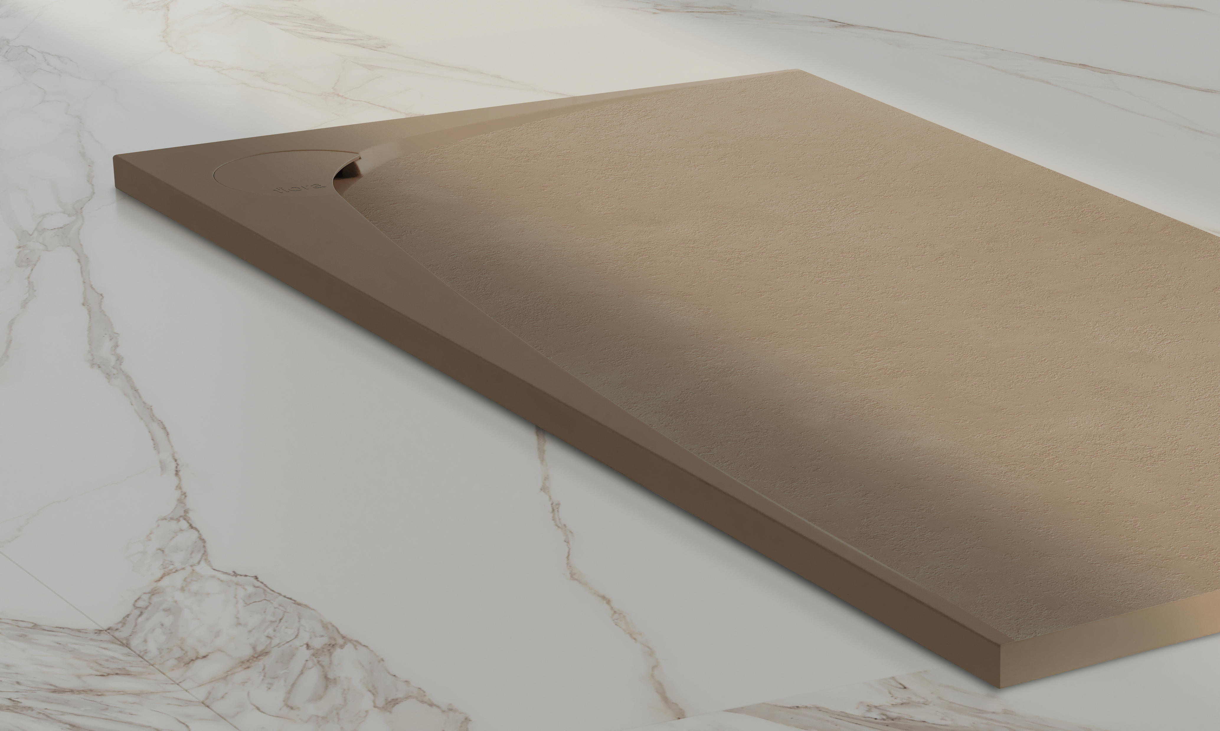 Sfera è il piatto doccia di Fiora dal design asimmetrico e dalle forme arrotondate ispirate alla natura.