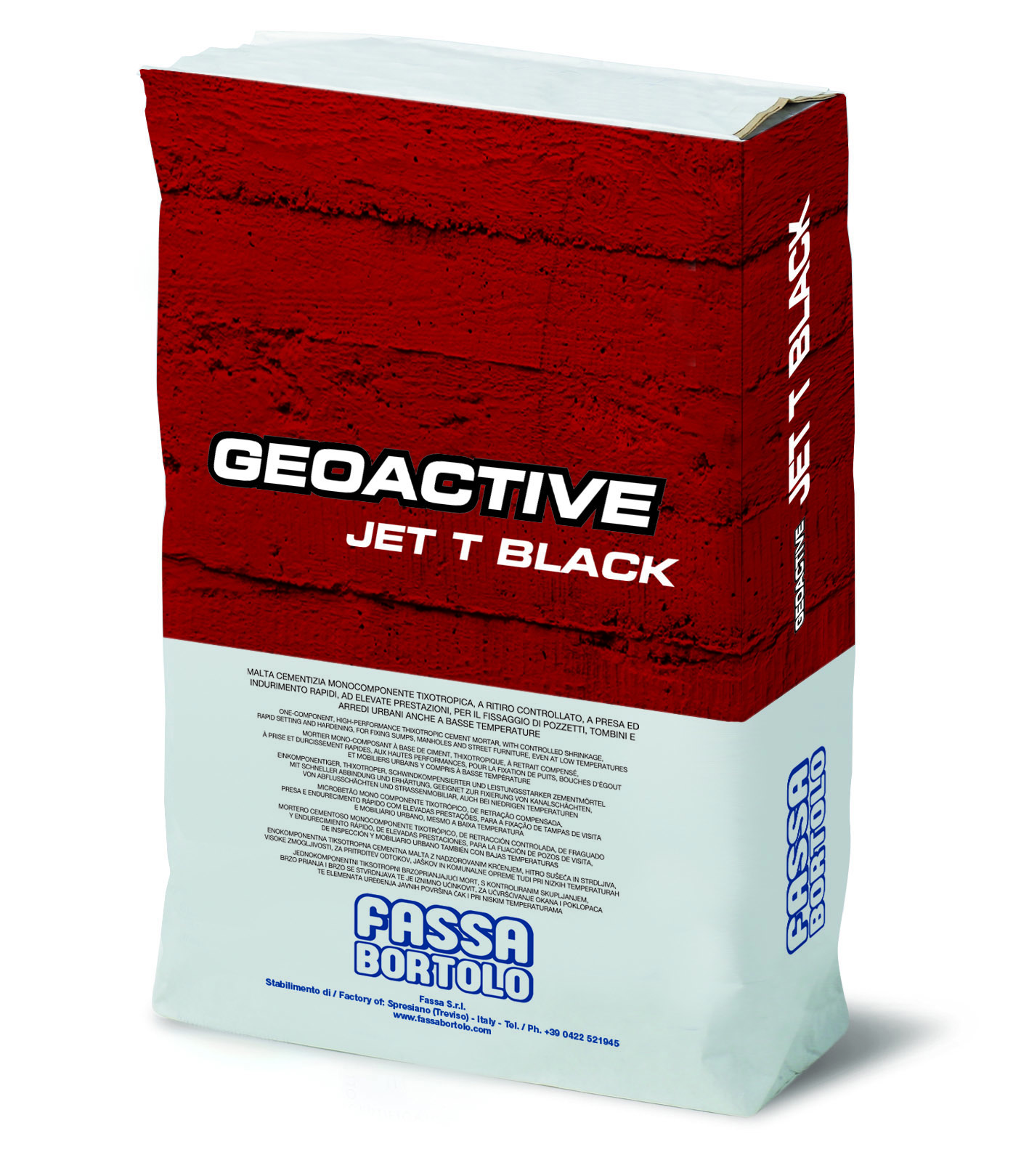 Lavorazione. Geoactive Jet T Black va impastato con il 15-16% di acqua mediante agitatore meccanico a basso numero di giri fino a ottenere un impasto omogeneo, privo di grumi e tixotropico. Si raccomanda d’impastare sempre quantitativi di malta che possono essere utilizzati entro i 15 minuti (a 20°C e 65% di u. r.).