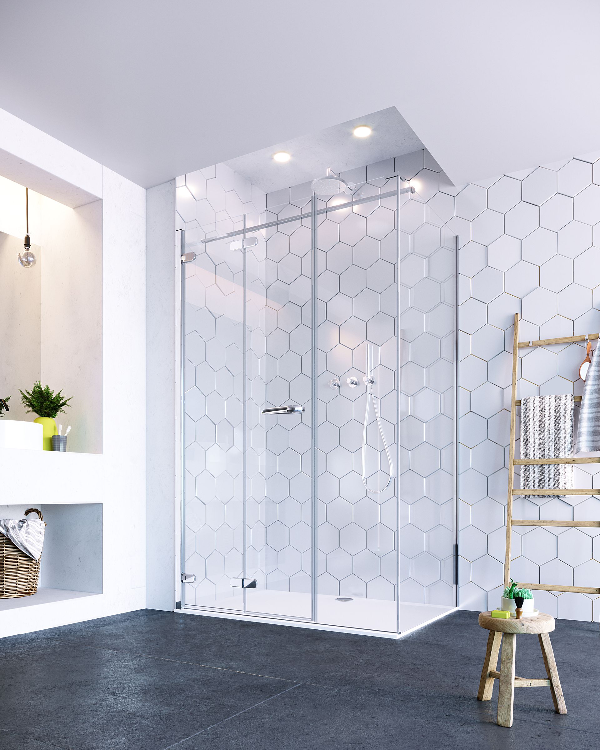 La porta pieghevole del box doccia Oro Bi-Fold è stata progettata per aprirsi con la stessa facilità sia all’esterno sia all’interno.