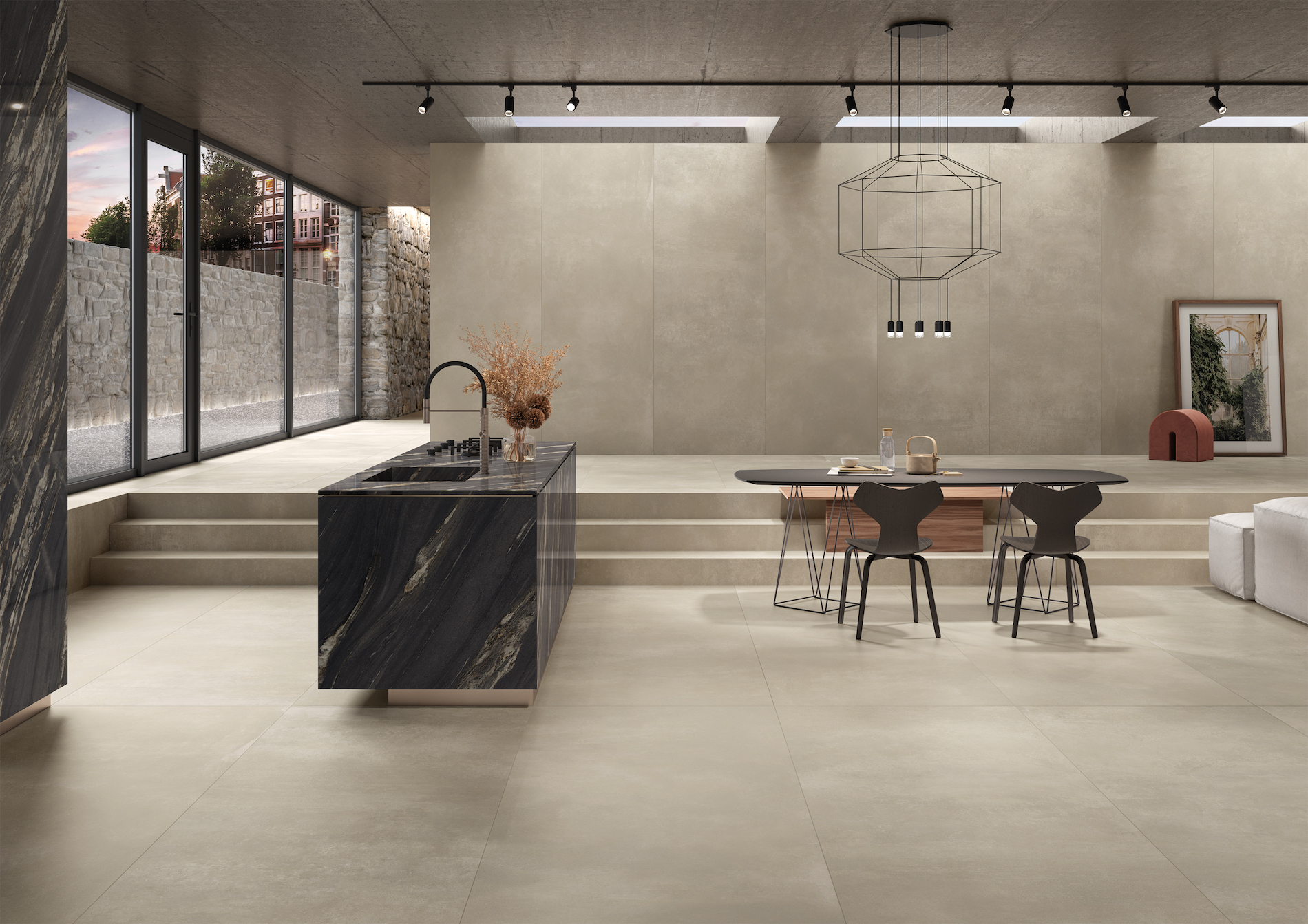 I grandi formati da 300×100, 150×100 e 100×100 cm e la finitura naturale aumentano le potenzialità espressive delle colorazioni e della materia.