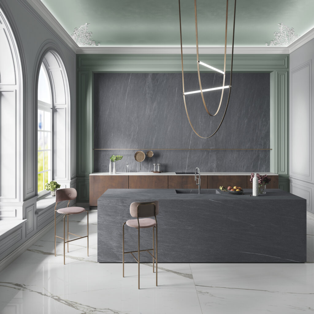 Tra le caratteristiche più interessanti delle superfici in gres porcellanato troviamo la personalizzazione e la capacità di riprodurre numerose texture. Pietra MaxFine è la collezione in gres porcellanato lanciata da FMG Fabbrica Marmi e Graniti dedicata proprio a questo affascinante materiale. Insieme a Lunar Stone e Tyrol Stone, troviamo la nuova Tuscany Stone, la texture che riproduce le fattezze di un’arenaria metamorfica delle Alpi Apuane. Dal punto di vista estetico, Tuscany Stone presenta un fondo grigio scuro percorso da venature bianche. L’effetto estetico è minimal ed elegante.