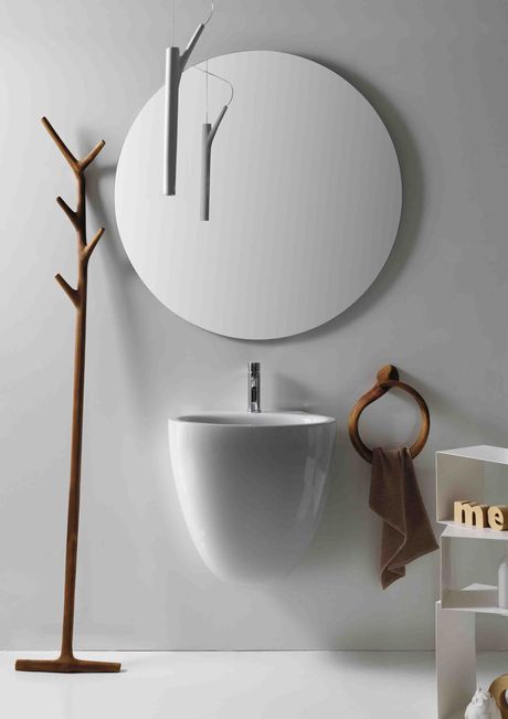 Una linea completa nel quale trovano posto lavabi sospesi, con colonna e d’appoggio, sanitari sospesi e d’appoggio, mobili, specchi e una particolarissima serie di accessori in legno massello di iroko come porta-asciugamani, tavolini, portarotolo, lampade e attaccapanni.