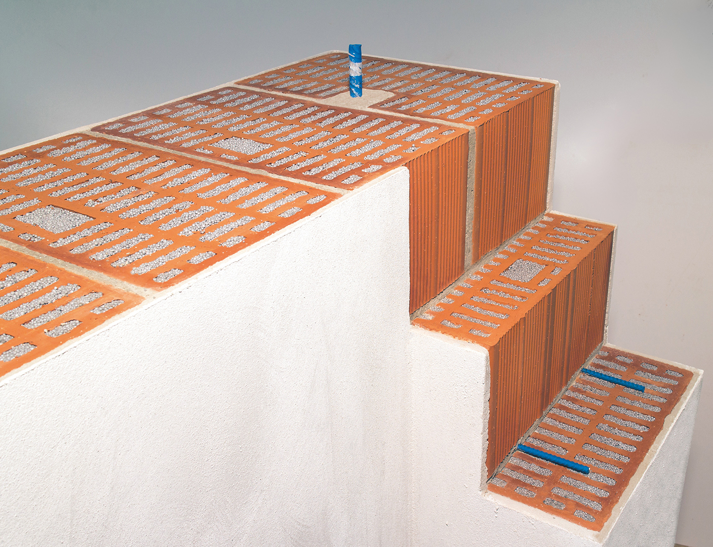 Il cuore del sistema è costituito da blocchi in laterizio Poroton P800, integrati con polistirene espanso additivato con grafite, che assicurano ottime prestazioni sia meccaniche che termiche.