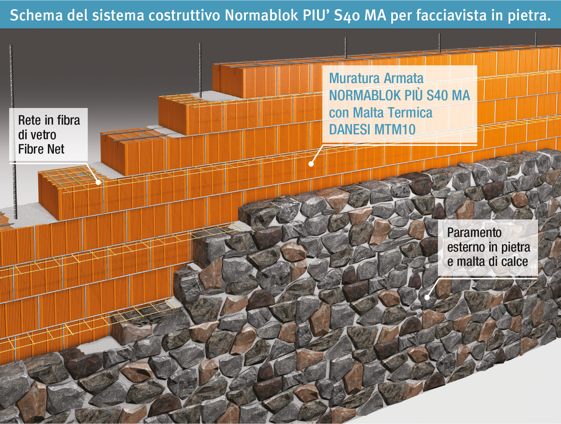 Per rispondere a queste esigenze, Fornaci Laterizi Danesi propone il sistema Normablok Più S40 Ma, una muratura armata innovativa che consente di ancorare un paramento esterno in pietra facciavista alla parete strutturale mediante una rete in fibra di vetro. In questo modo si crea una struttura monolitica e resistente, in grado di affrontare le più elevate sollecitazioni sismiche.