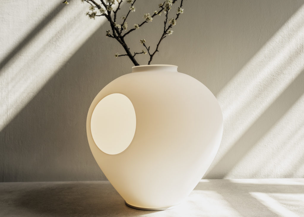 La luce di madre è intima e calda; il grande corpo luminoso accoglie nell’incavo superiore un vaso in vetro borosilicato satinato, dove è possibile alloggiare alcuni rami decorativi, per creare un insieme sobrio ed elegante, ottenendo un oggetto personalizzabile e sempre diverso.