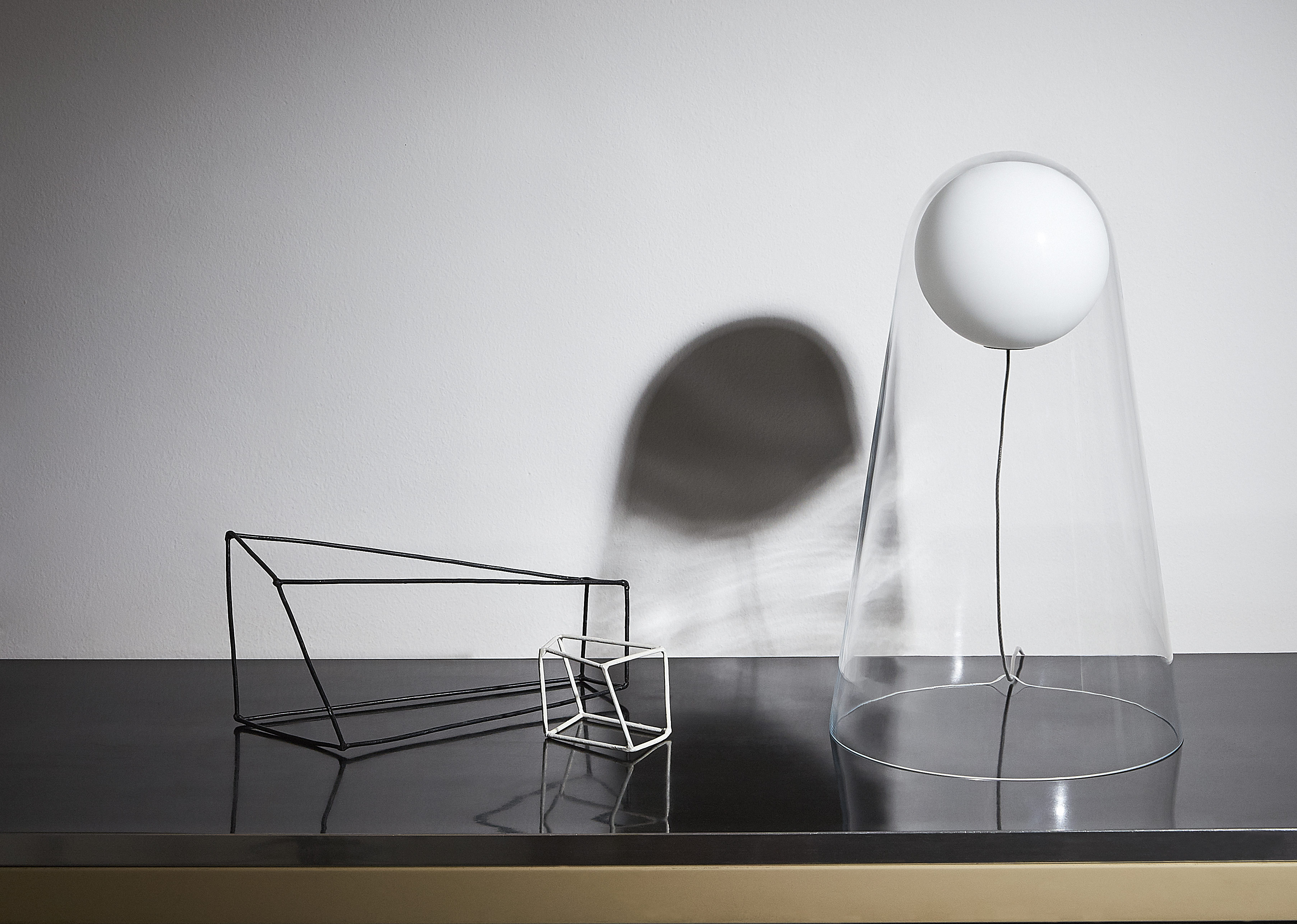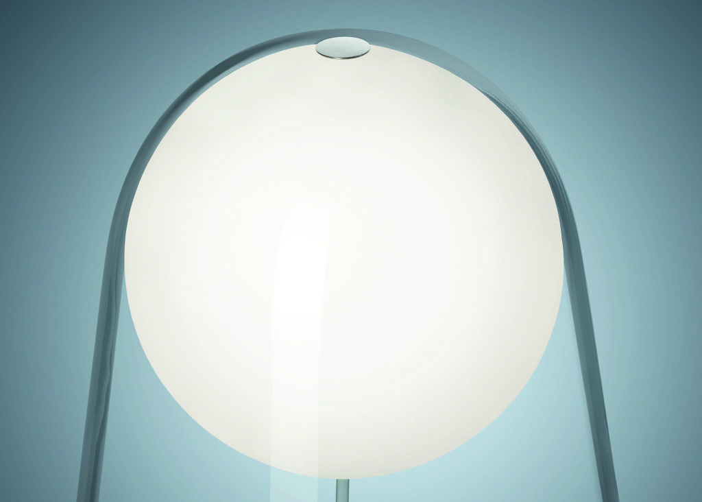 La lampada ha un design caratterizzato da un globo luminoso sospeso, che ricorda la luna nel cielo notturno o una sfera di luce ricoperta da un drappo trasparente e impalpabile. È un oggetto semplice e di immediata lettura, ma anche inedito e profondo nella sua poetica leggerezza.