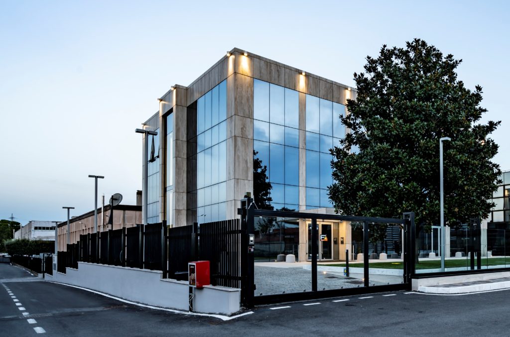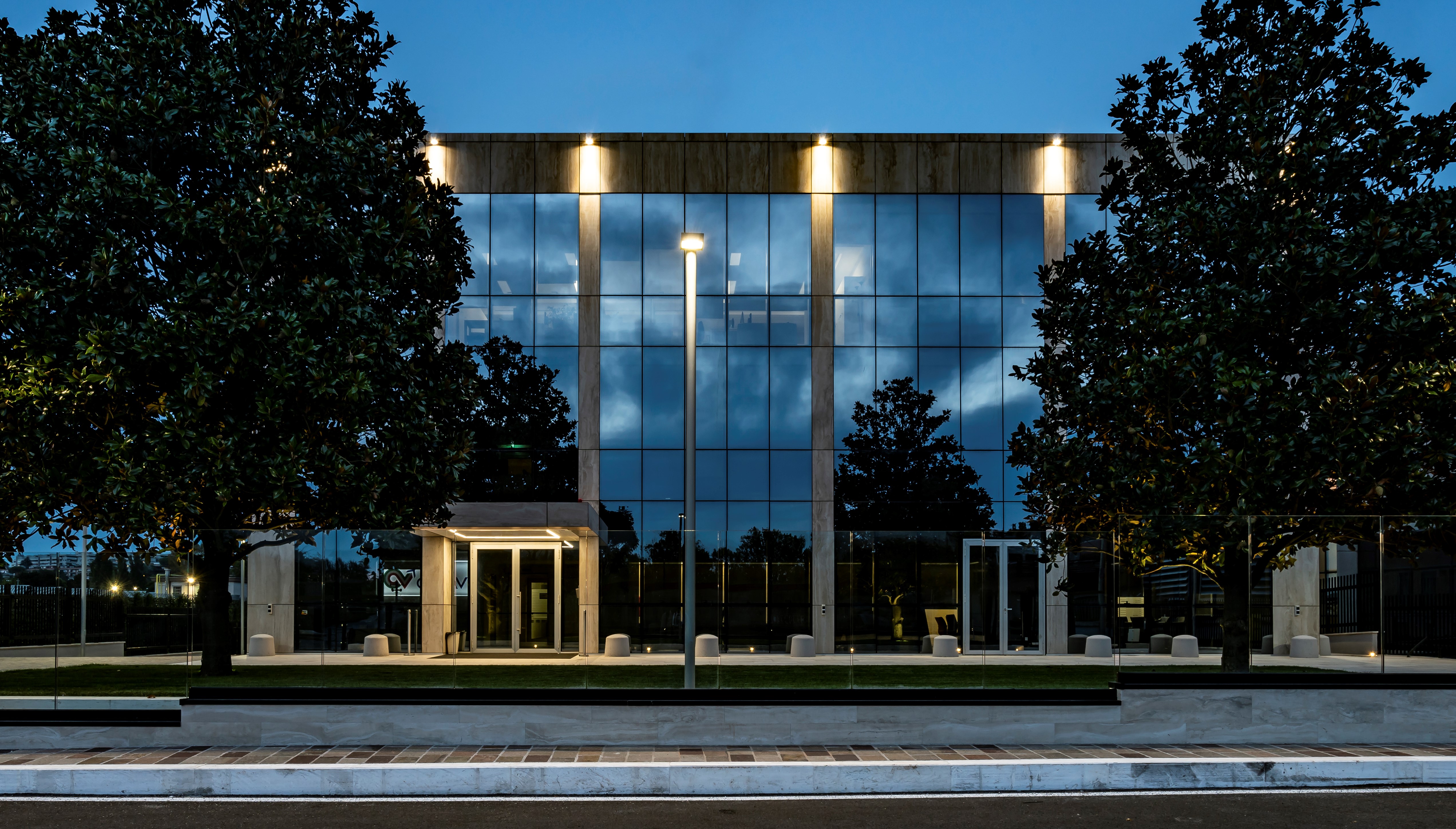 L’edificio di via Salaria, sottoposto recentemente a riqualificazione realizzata dallo Studio Speri, presenta grandi pareti vetrate intervallate da superfici strette e verticali rivestite in gres porcellanato effetto travertino, utilizzato anche per la pavimentazione dell’ingresso, al fine di creare quell’effetto di continuum materico tra piani verticali e orizzontali.