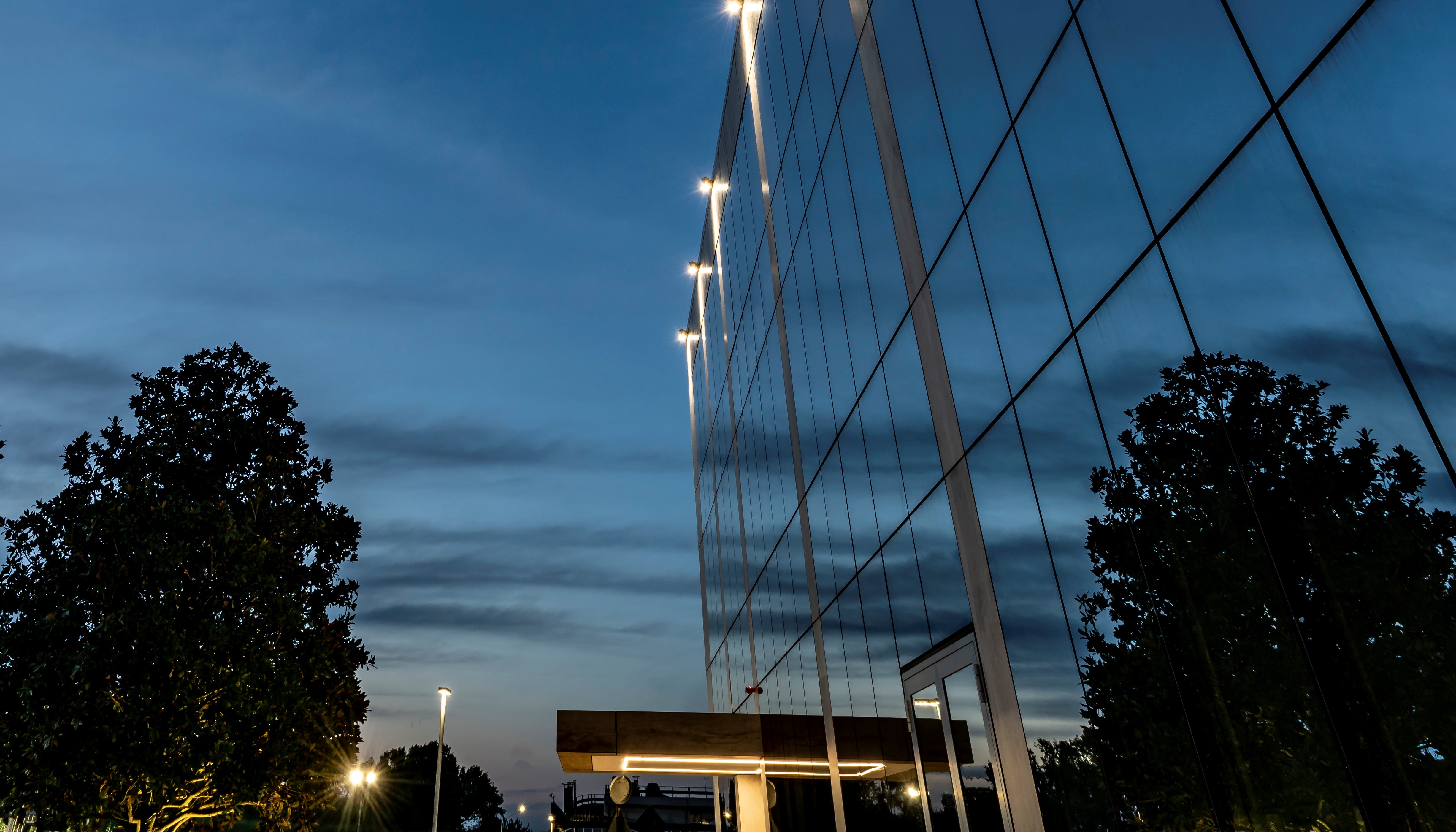 L’illuminazione è stata quindi realizzata mediante l’utilizzo di applique Mok posizionate nella sommità dell’edificio: dotate di led di nuova generazione e abbinate a lenti con fasci molto stretti hanno consentito di ottenere un effetto “lame luminose” sui prospetti ma con livelli di illuminazione importanti anche sugli spazi antistanti: un esempio concreto di luce intelligente che non tralascia la funzione estetica, ma che la integra e la completa.
