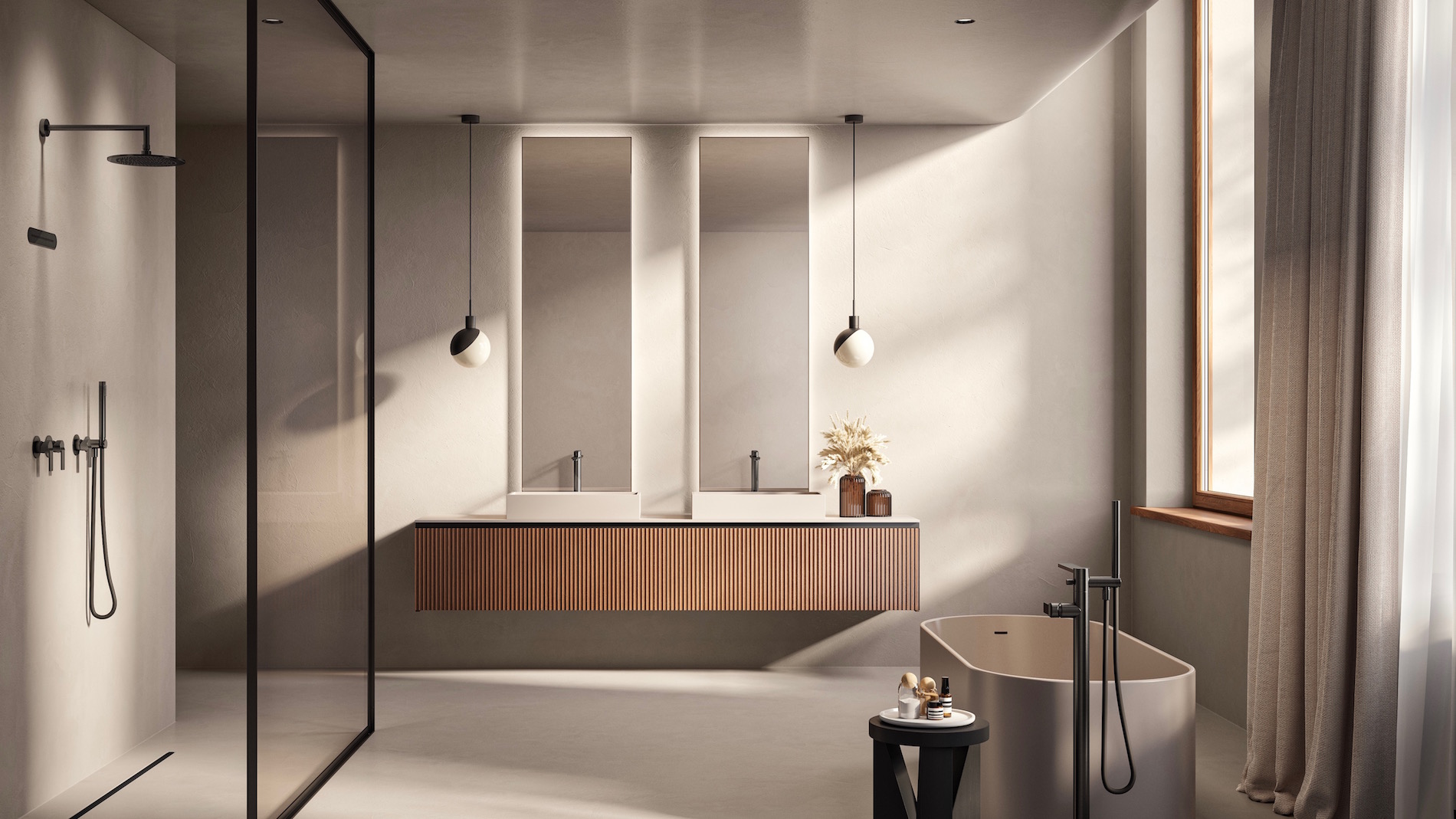 La soluzione per la vasca a pavimento è una vera scultura di 105,8 cm di altezza, con una bocca slanciata di 19,7 cm, doccia a mano minimale e ampio flessibile agganciato direttamente al supporto del rubinetto.