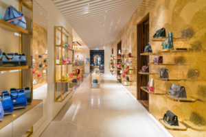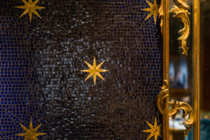 I pavimenti del pianterreno sono stati decorati con tessere di marmo di diversi colori, allineati con le tonalità cromatiche che caratterizzano ogni ambiente della boutique. La parete principale è stata impreziosita da tessere di vetro con foglia d’oro 24 carati che disegnano un motivo a ventaglio. Di grande suggestione, infine, la sala dedicata alla gioielleria con pareti in mosaico ispirate al cielo stellato della Basilica di San Marco.