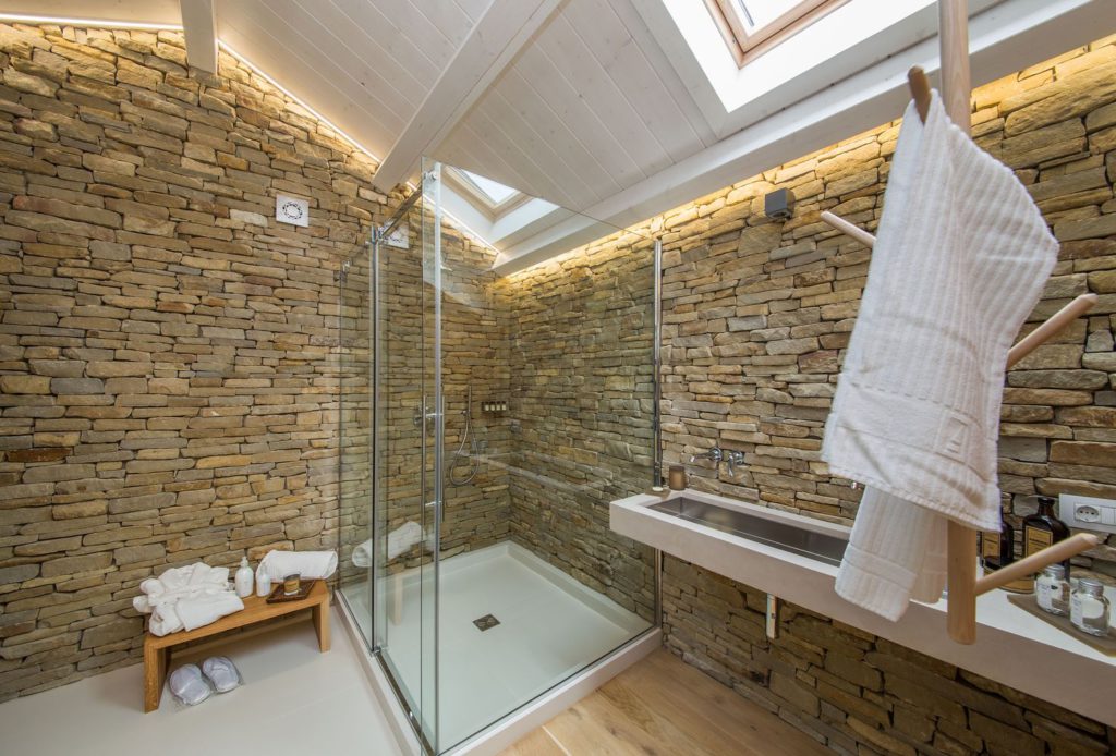 «Abbiamo lavorato nell’ottica di portare alla prestigiosa certificazione ClimaHotel questa struttura. Sarà la prima nelle Marche a rispettarne integralmente i tre principi: ecologia, economia e cultura. Le suite sono caratterizzate da un linguaggio architettonico che punta a rileggere in chiave contemporanea alcuni elementi caratteristici delle abitazioni rurali, introducendo un elevato livello di produzione artigianale per il progetto di interior di qualità. Elemento fortemente caratterizzante è il bagno, cardine della distribuzione al piano terra evidenziato, come nella tradizione rurale marchigiana, dall’utilizzo di una differente e sovrapposta pavimentazione posta come un tappeto a segnare una stratificazione storica, in questo caso cotto smaltato a mano, che segna la presenza, esterna al locale bagno, del lavabo. Ingresso, camera, sottotetto, sono invece caratterizzati dall’utilizzo di parquet ‘industriale’ in rovere naturale, certificato e posato con colle e finiture prive di formaldeide e prodotti sintetici».