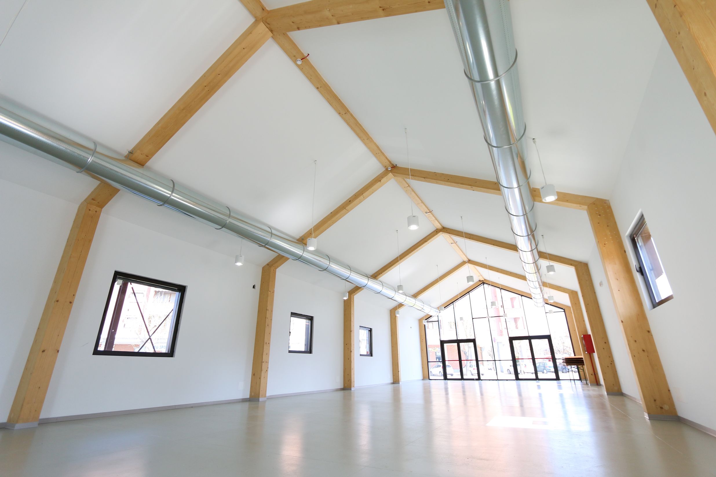 Lungo la galleria espositiva, è stato necessario definire degli irrigidimenti verticali a supporto delle travi di legno lamellare in copertura, realizzando perciò una struttura a portali ripetuti che collaborasse con l’elemento di parete e consentisse una libertà straordinaria nell’utilizzo dell’ambiente, che si presenta con una pianta completamente libera.