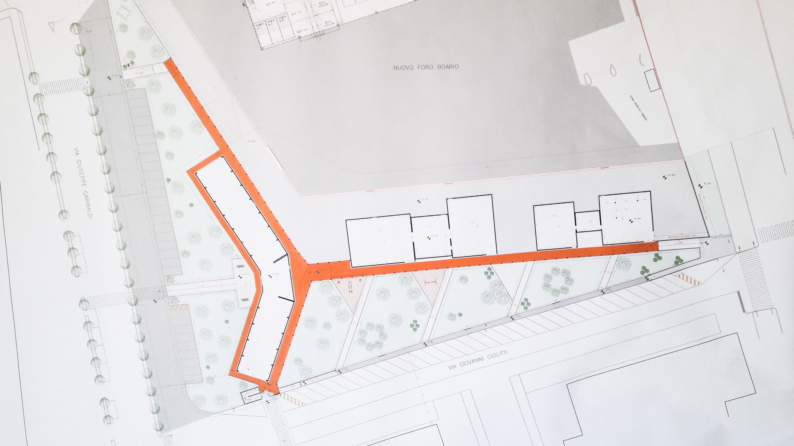 Questo intervento ha consentito di ampliare lo spazio della piazza e di ridefinire l’assialità dei volumi architettonici, ed è stata occasione per smantellare e sostituire la copertura esistente realizzata in amianto, materiale i cui effetti nocivi per la salute sono ormai universalmente noti. I tre corpi di fabbrica di nuova costruzione sono stati allineati lungo l’asse nord-sud con un ordine progettato in funzione delle necessità dei futuri fruitori dell’area.