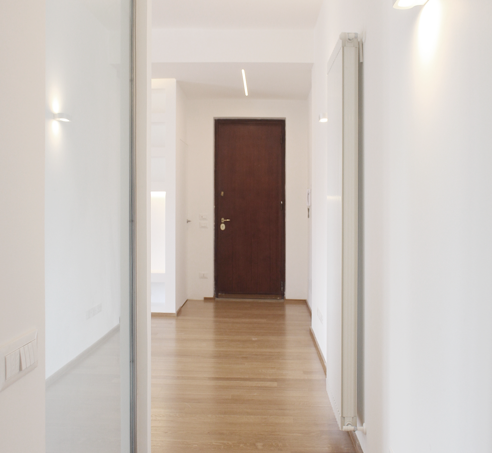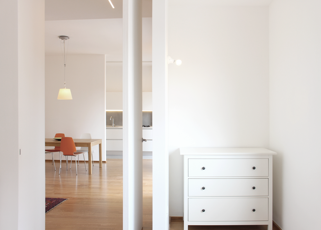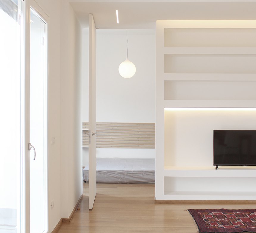 La prima cosa da fare è stata “svuotare” tutto l’appartamento e ridistribuire le diverse metrature. «Occorreva – spiega il progettista – procedere con la demolizione di tutta la ripartizione muraria preesistente abbandonando qualunque ipotesi di nuova tramezzatura. Sono stati poi eliminati tutti gli architravi, gli stipiti, le mostre, i cassonetti avvolgibili e tutti quegli elementi che determinavano una discontinuità delle superfici murarie». L’ingresso, ora, si spalanca direttamente sul soggiorno, senza barriere visive, e solo da qui si può accedere alla camera da letto, le cui misure sono state ridimensionate.