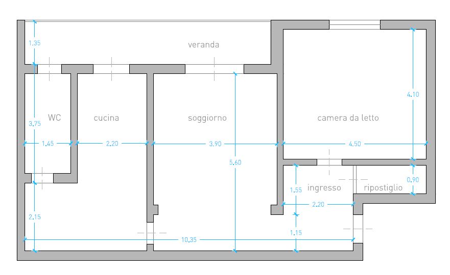 C’era un piccolo ingresso da cui si accedeva all’unica camera da letto, molto spaziosa, e a un soggiorno dalle dimensioni contenute. Da qui, attraverso un’altra porta, si poteva entrare in una grande cucina per poi accedere al bagno. Una veranda su cui affacciava la zona giorno era poco sfruttata. I proprietari volevano dire addio a questi spazi un po’ angusti per creare, invece, una casa senza inutili porte, luminosa e con spazi fluidi. L’idea di realizzare una pianta aperta con uno spazio centrale da cui raggiungere tutte le altre funzioni è stata dell’architetto Gaspare di Maggio dello studio Gda.
