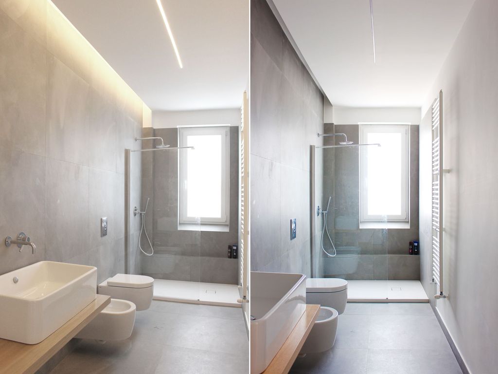 Il lavabo con rubinetteria da incasso poggia su un top in legno di rovere che richiama il parquet del resto della casa, e i sanitari ceramica bianca smaltata sono sospesi. Tutto il bagno è illuminato da una luce a cascata a Led, installata a scomparsa sul soffitto.