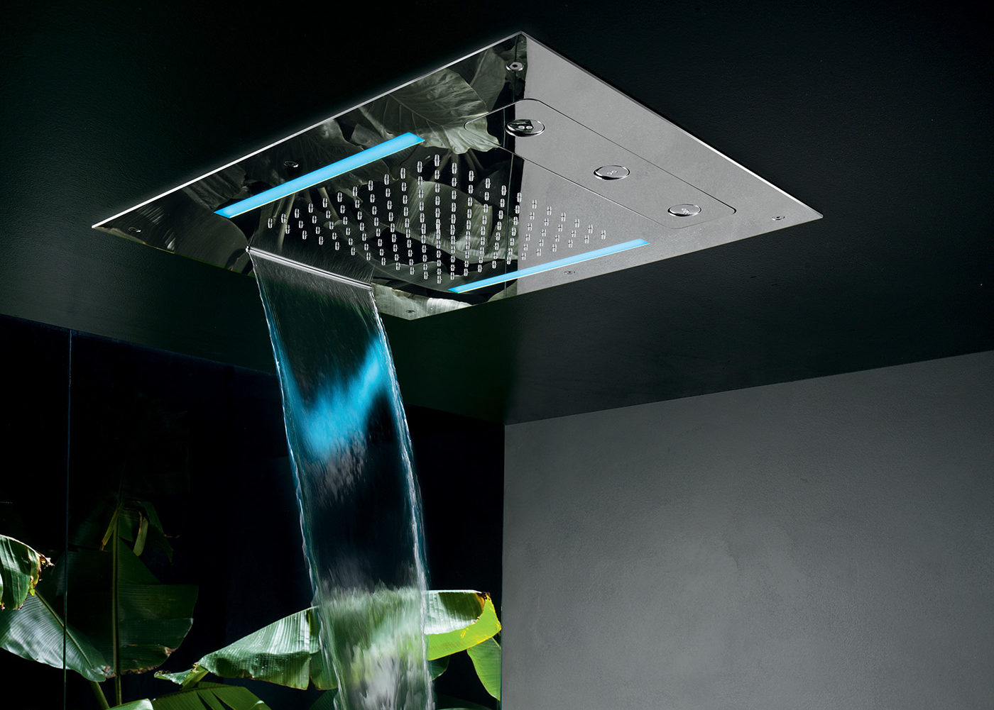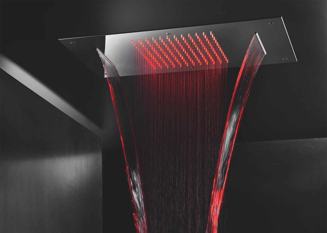 La funzione automatica che permette di accendere la luce a led, contemporaneamente all’apertura dell’acqua, garantisce, inoltre, il massimo comfort funzionale. Con un solo gesto, attraverso un semplice telecomando, è possibile regolare luci e getti per una benefica azione combinata. Infine, ogni soffione è disponibile con due, tre o quattro differenti erogazioni idriche, quali getti a cascata, double jet,a pioggia oppure orientabili, per selezionare lo zampillo ideale per il rilassamento più totale nel proprio spazio doccia.