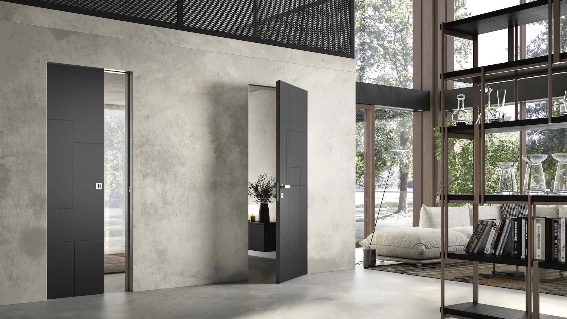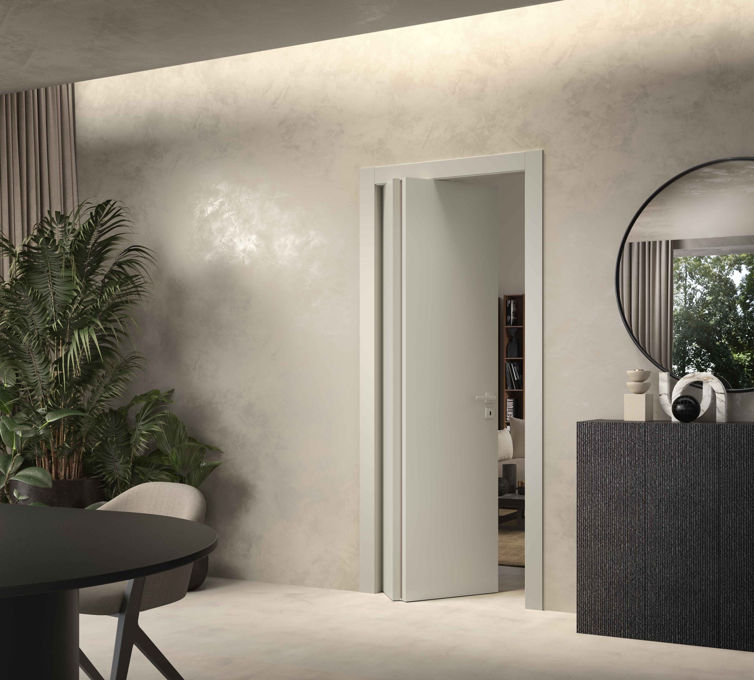 Tante le declinazioni di questa serie. Ad esempio: la versione scorrevole con guida nascosta che se si sceglie in una versione colore ripreso anche sulle pareti ne darà continuità visiva diventando essa stessa elemento connotante dell’ambiente. Le porte si possono anche abbinare per modalità di apertura nella stessa stanza, secondo le necessità.
