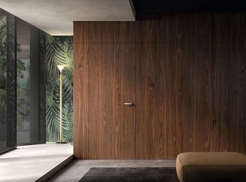 Il legno, con la sua caratteristica venatura a vista, evoca sempre un’eccelsa maestria artigianale, che nonostante la sua radice classica, può assumere un’apparenza estremamente contemporanea. È il caso della porta a battente filo parete, Eterea della collezione Imago, realizzata in noce canaletto, che, accostata alla boiserie rifinita con la stessa essenza, è in grado di decorare un’intera parete con un fascino irresistibile, che richiama le case del Novecento milanese.
