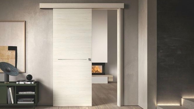La la serie Pegaso propone porte lisce e moderne, facili da installare grazie al sistema reversibile, adattabile nel verso di apertura. Più tenue e delicata è invece la nuance Jota scelta per la porta della linea Medusa, in versione scorrevole tipo “B” esterno muro con Mantovana.