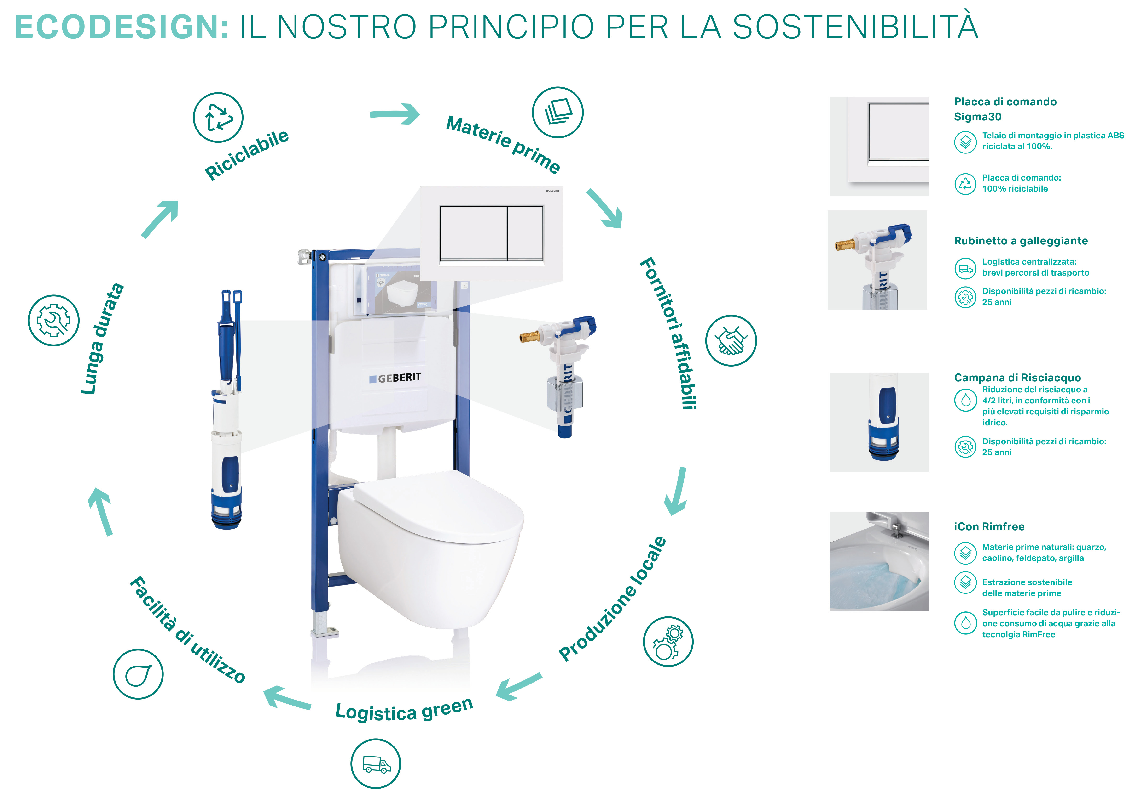 Dal 2007 Geberit sviluppa i nuovi prodotti nel rispetto dei principi dell’Eco-Design. Risultato della selezione dei materiali più adatti con la continua ricerca di alternative ecologiche e prive di sostanze inquinanti, i prodotti Geberit si caratterizzano per la facilità di manutenzione e pulizia e ottima durata.