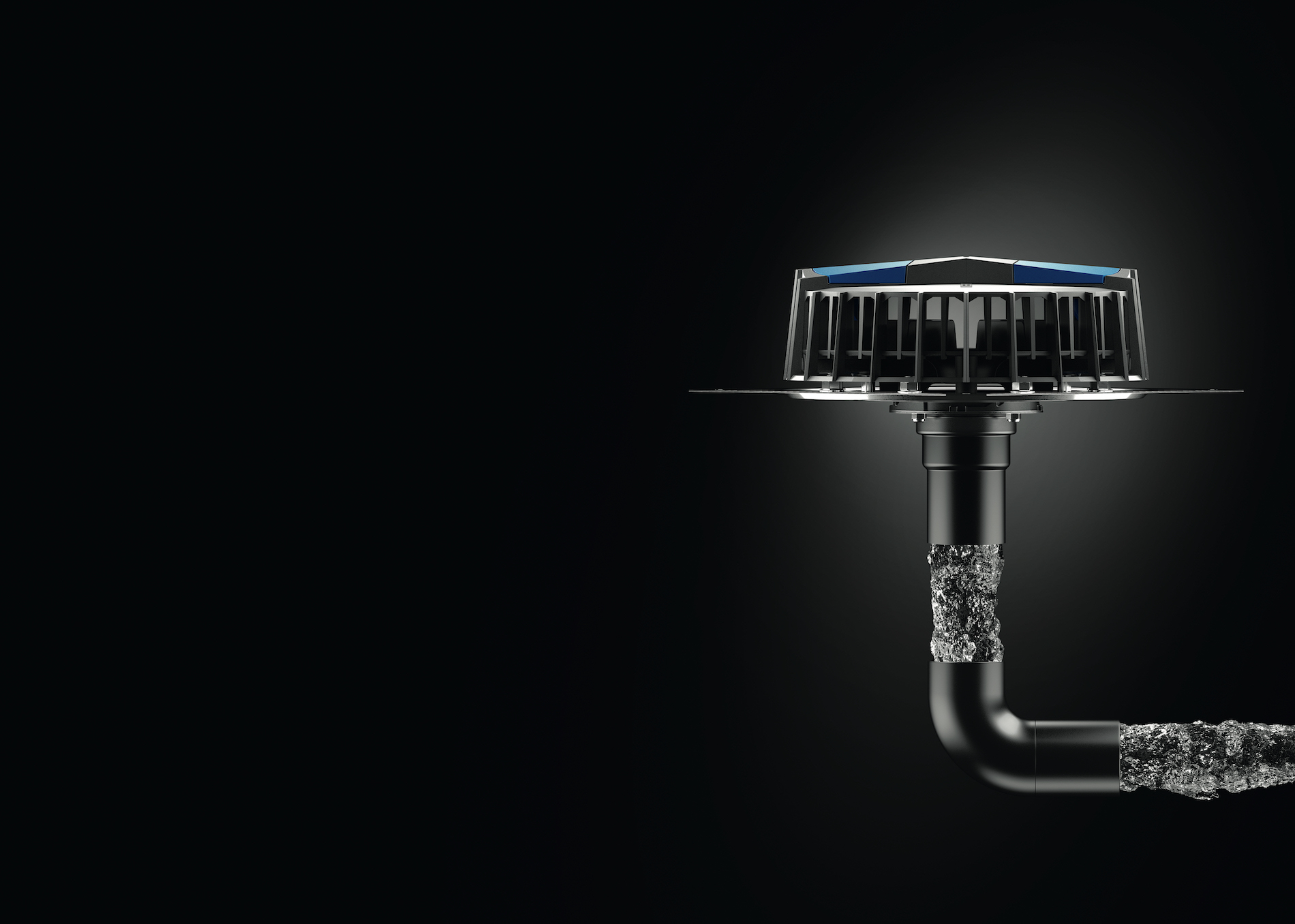 Con il sistema in depressione Geberit Pluvia, i tubi dai diametri ridotti si riempiono completamente in caso di forte pioggia, creando una colonna di acqua piena che fa sì che l’acqua venga aspirata dal tetto per depressione. L’imbuto di scarico Geberit Pluvia assicura inoltre che l’acqua meteorica defluisca in modo continuo e che l’effetto sifonico non si interrompa. Contemporaneamente, l’elevata velocità della portata assicura l’autopulizia del sistema, riducendo i costi di pulizia e manutenzione.