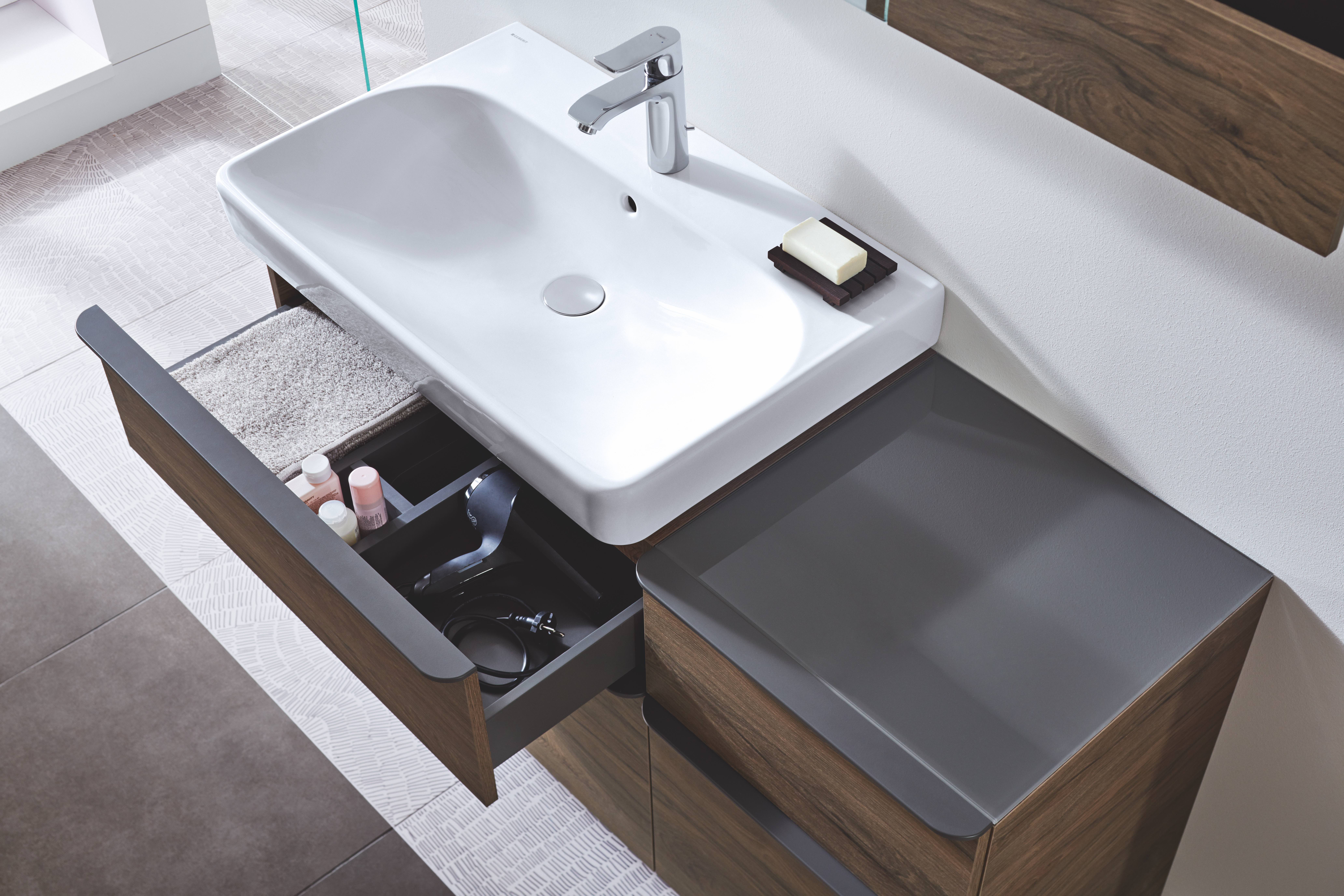 La linearità delle forme continua nella collezione di mobili e complementi d’arredo abbinabili alle ceramiche Geberit Smyle. Le finiture dei mobili sono infatti declinate in quattro diverse varianti cromatiche: bianco lucido, grigio lava opaco, sabbia lucido e noce americano. Le maniglie sottili e arrotondate riprendono il profilo armonioso dei lavabi, mantenendo un linguaggio stilistico ben definito e omogeneo, in quanto vengono proposte nello stesso colore del mobile.