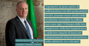 Il modello di crescita economica basato sulla riqualificazione del patrimonio immobiliare esistente – un modello di edilizia sostenibile sul quale l’Italia vuole e deve investire, assieme alla sanità, all’istruzione e all’innovazione digitale – assegna ai geometri un ruolo da protagonisti.