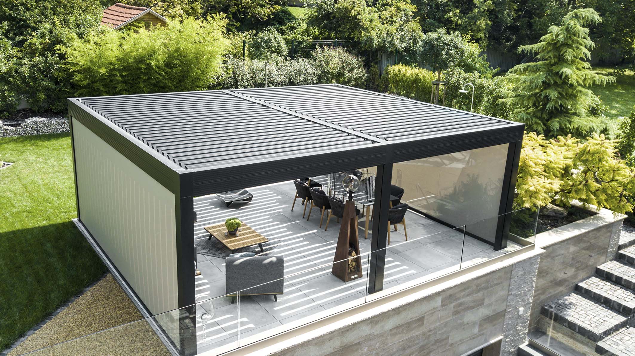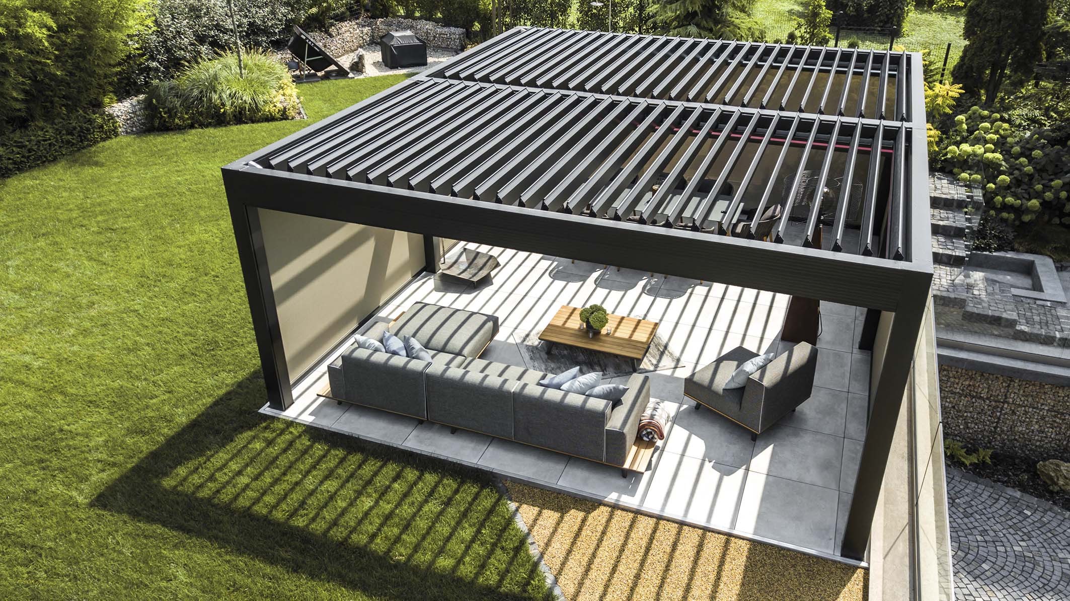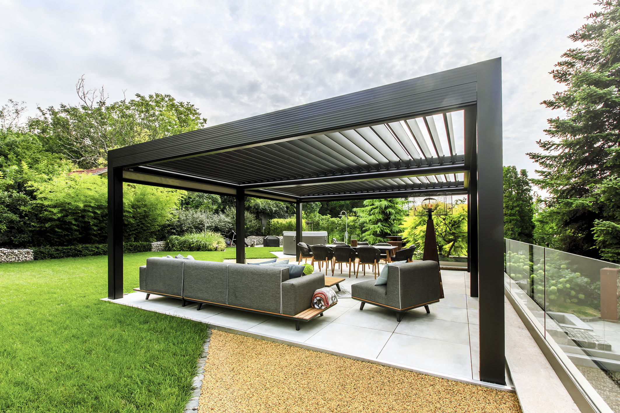 La pergola bioclimatica è altamente tecnologica e caratterizzata da un’estetica essenziale.