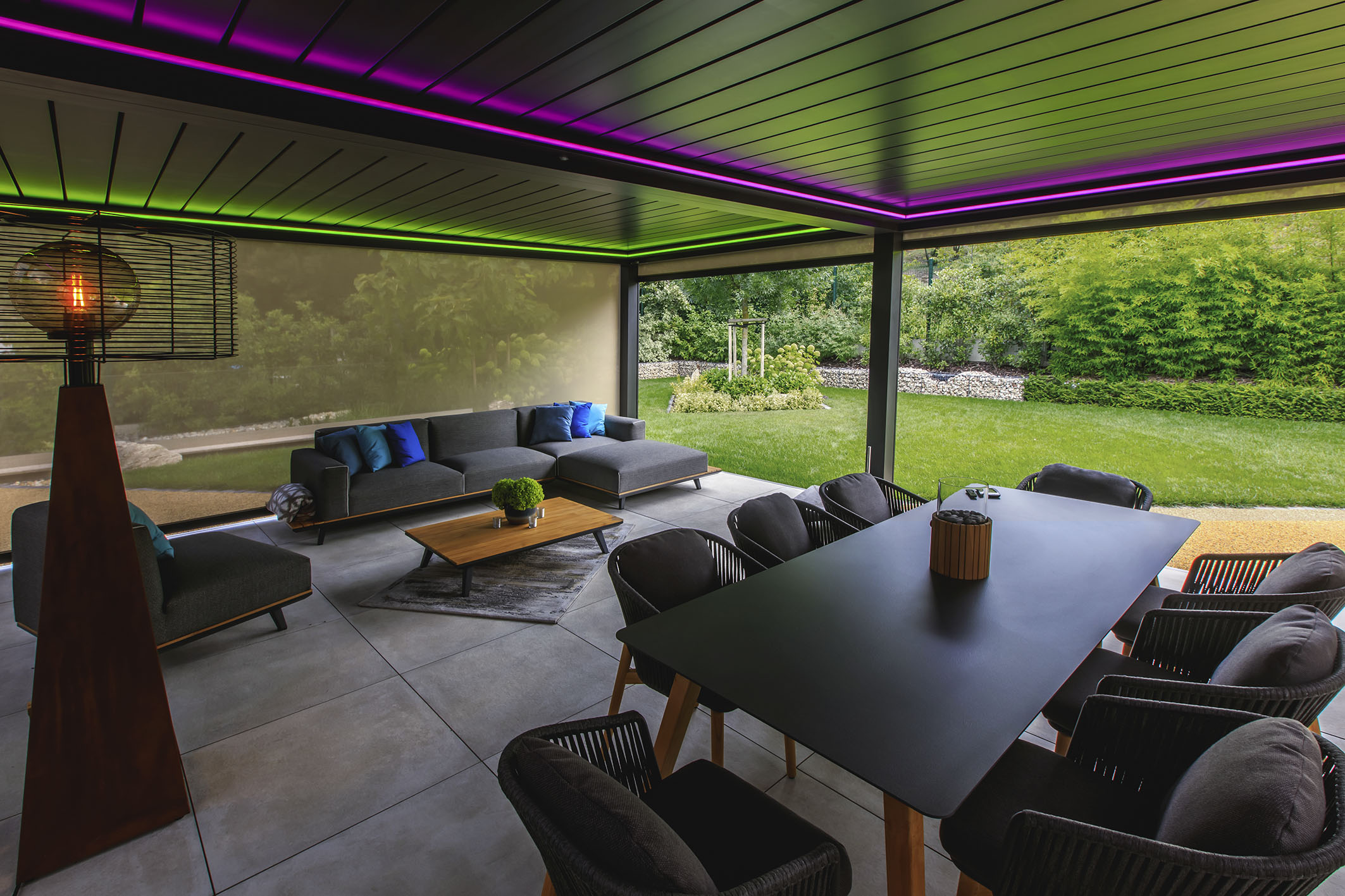 L’armonia della pergola Gibus è esaltata dal sistema di illuminazione a LED RGB integrato nella struttura, che consente di creare un’atmosfera elegante ed emozionante.
