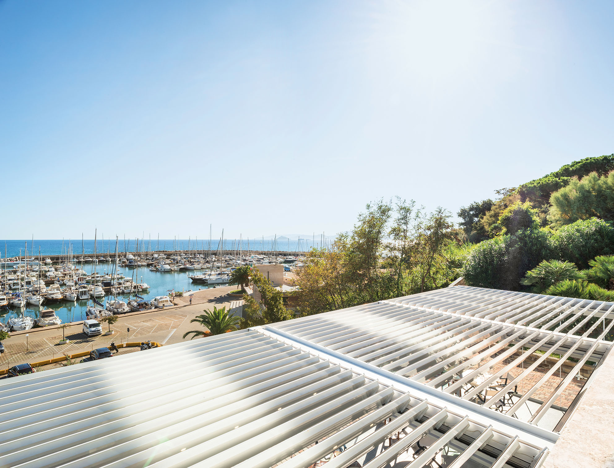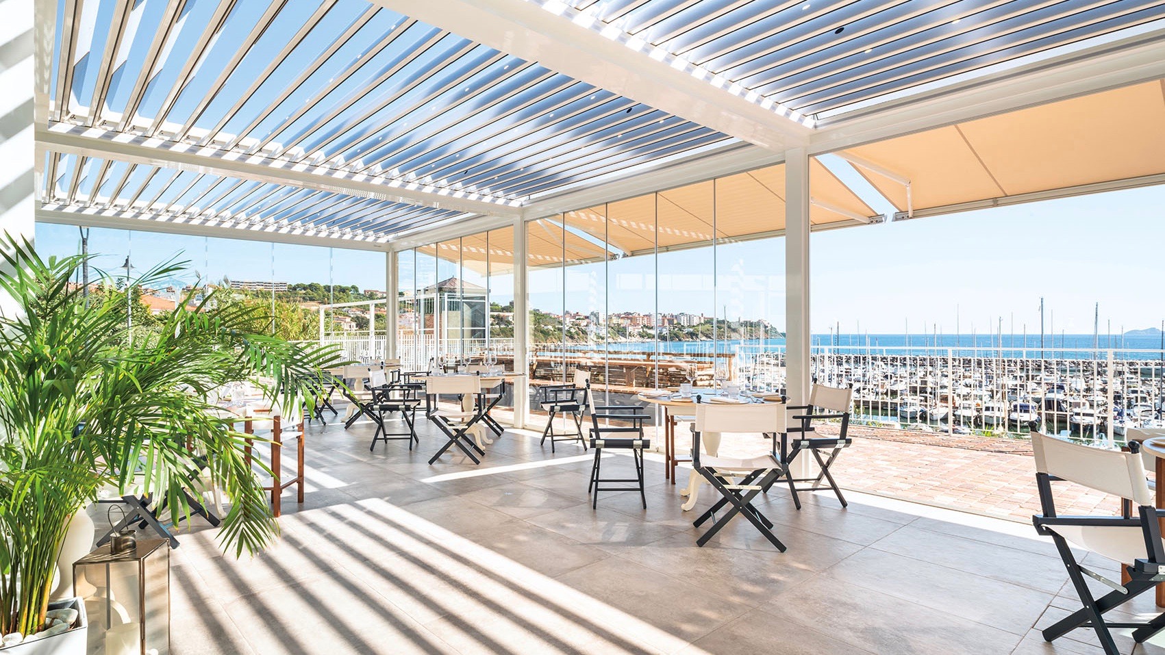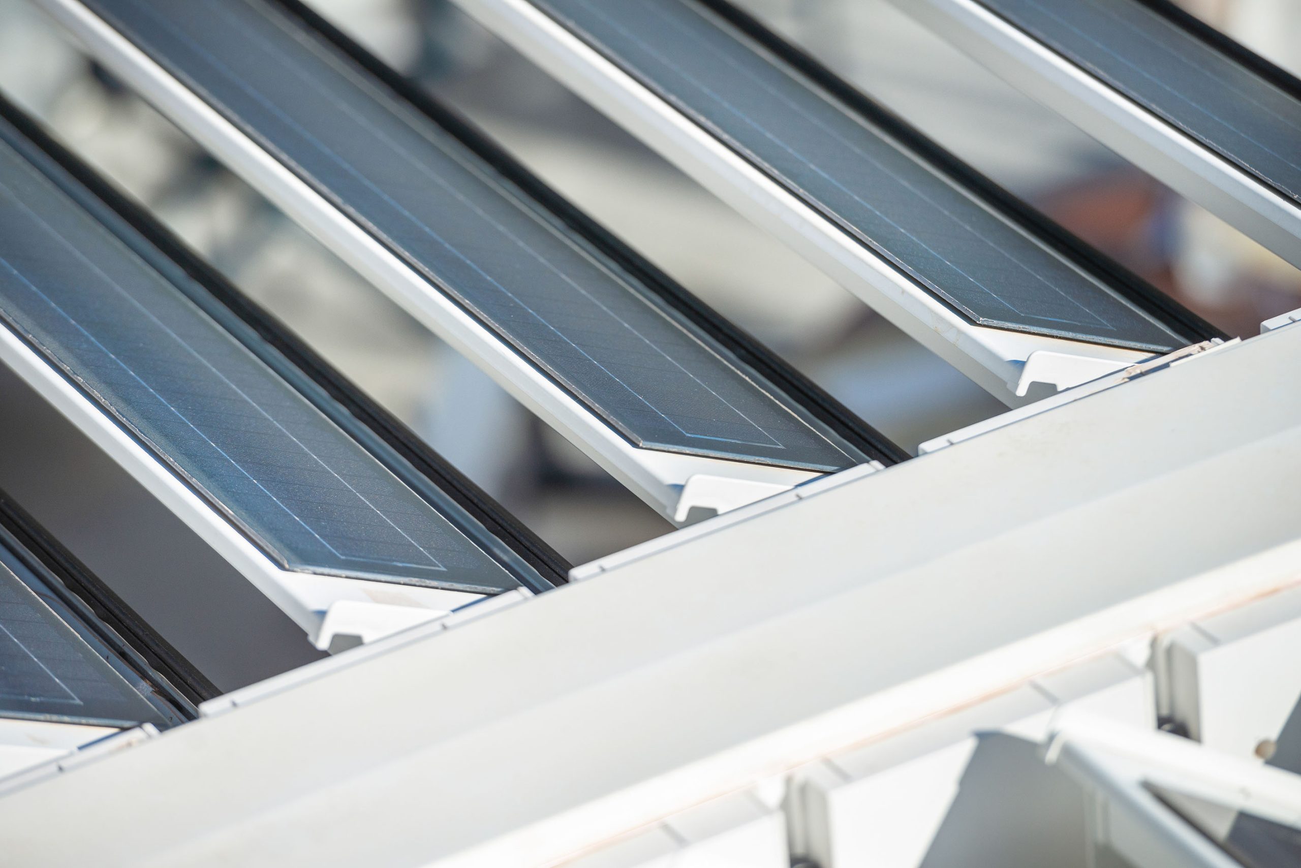 Aregolare il flusso d’aria e la luce diretta, nonché a proteggere le persone in caso di pioggia, le lame frangisole orientabili sulla copertura della pergola sono infatti equipaggiate con moduli fotovoltaici, che consentono di ridurre il consumo energetico del ristorante.