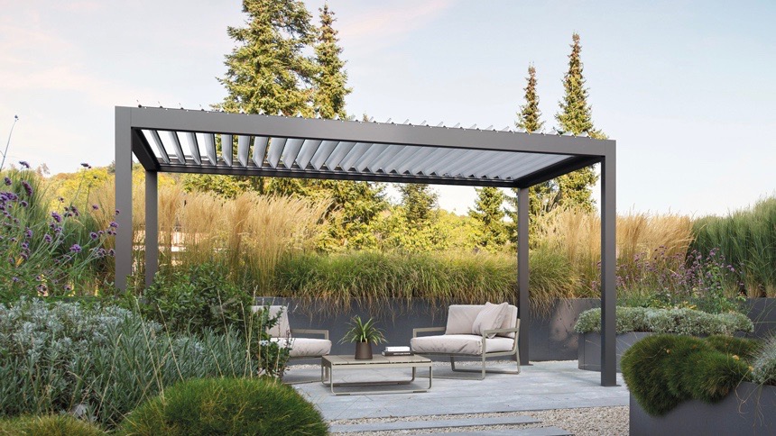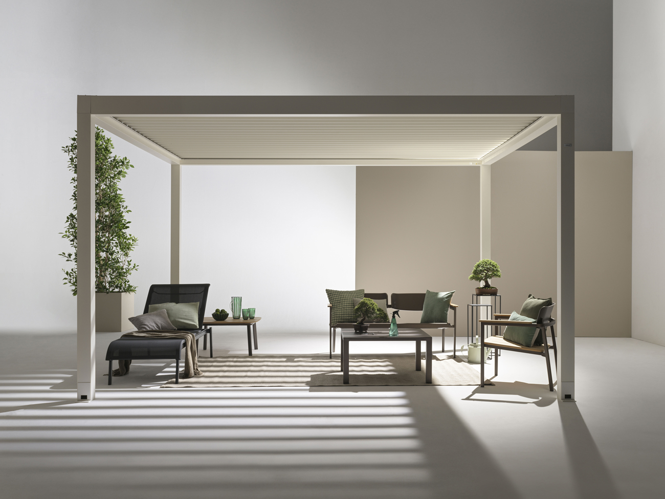 Oltre ad un design pulito e contemporaneo, Movie vanta prestazioni tecniche di valore: le lame di copertura ruotano fra 0° e i 115° attorno al perno inferiore, proteggendo così tanto dai raggi solari che da vento e precipitazioni. Ancora, questa pergola può essere ulteriormente riparata con vetrate scorrevoli e schermature zip che assicurano il massimo comfort. Inoltre, la struttura può essere dotata di illuminazione a led, divenendo così ancora più versatile.