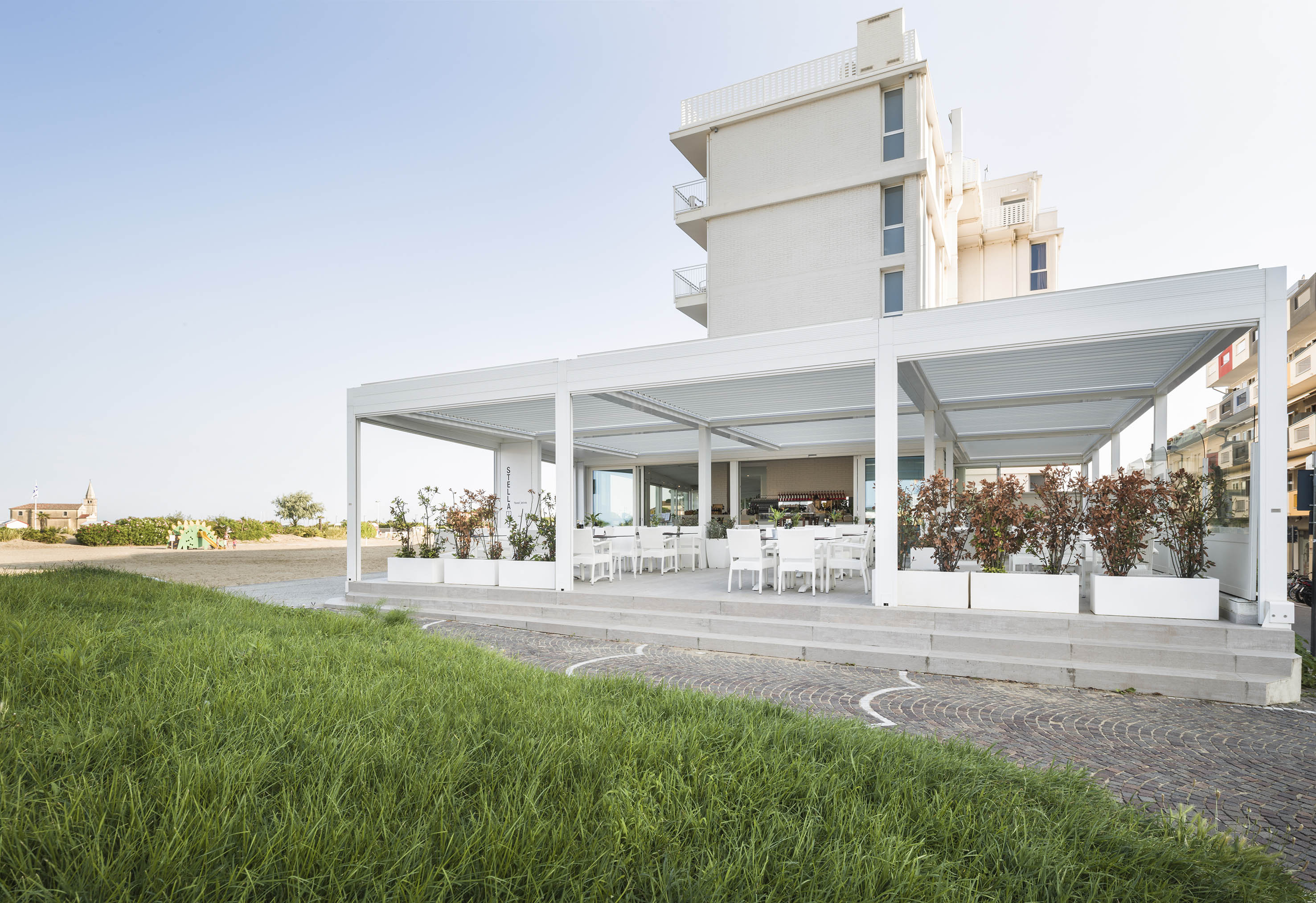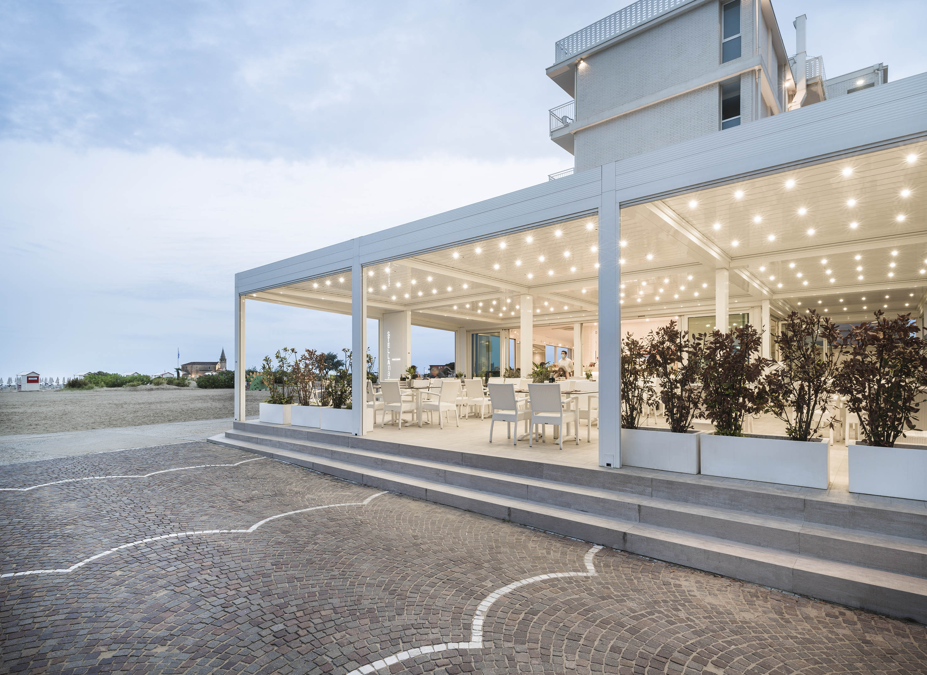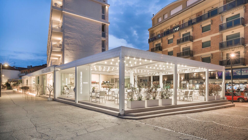 Caorle è una delle località sul mare più belle del Veneto: qui si trova lo Stellamare Beach Hotel, una location molto frequentata dai turisti e abitanti del luogo. La proprietà dell’hotel ha scelto di rinnovare interamente la terrazza al piano terra optando per una soluzione che coniugasse stile, comfort e tecnologia.