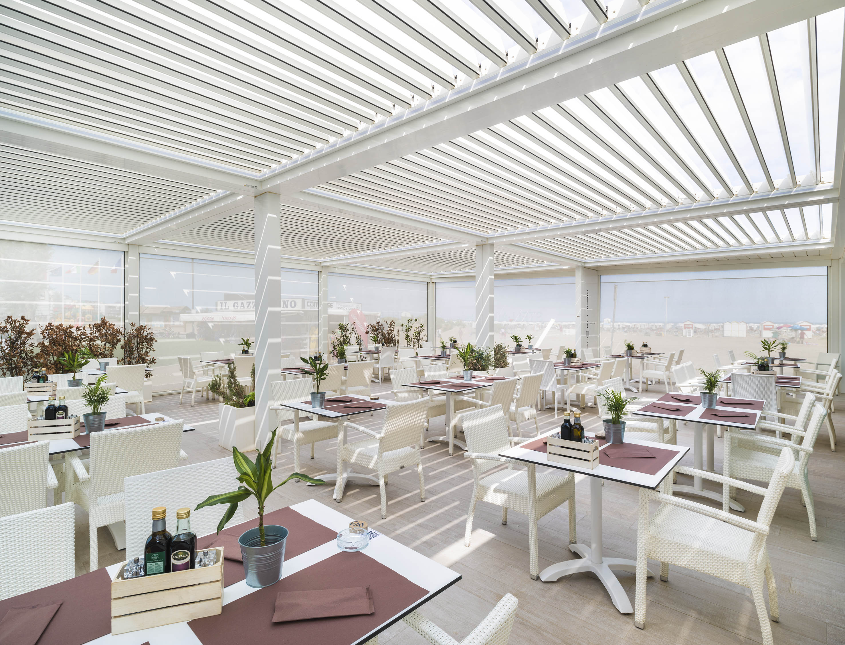 Le lamelle orientabili permettono di moderare l’irraggiamento del sole diretto e di gestire il flusso d’aria naturale. In caso di necessità possono essere chiuse ermeticamente proteggendo gli ospiti dalle intemperie.