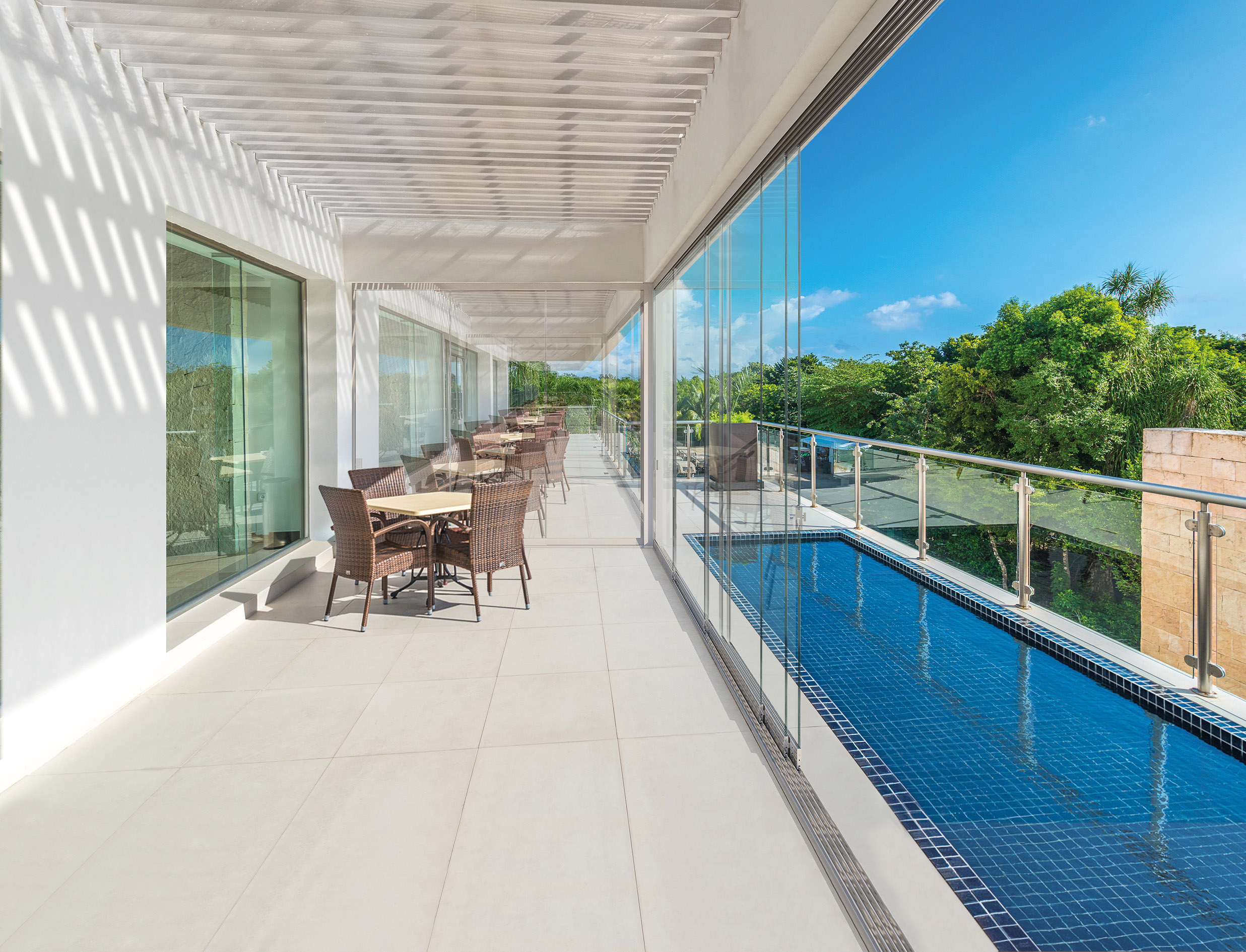 accogliente e riparato nelle stagioni intermedie, permettendo comunque di godere di una piacevole visione sulle aree esterne e dell’illuminazione naturale, mentre, aperta, dà vita a un’area non solo salubre e arieggiata, ma anche visivamente fluida, in cui indoor e outdoor si fondono in un dinamismo che integra benessere, funzionalità e bellezza.