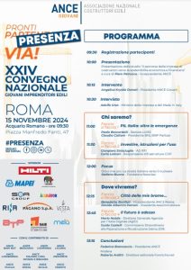 Il XXIV Convegno nazionale dei Giovani Ance dal titolo Pronti, presenza, via! si terrà domani, venerdì 15 novembre, a partire dalle ore 9:30, presso l’Acquario romano in Piazza Manfredo Fanti 47 a Roma, con la partecipazione del ministro delle Imprese e del made in Italy, Adolfo Urso.