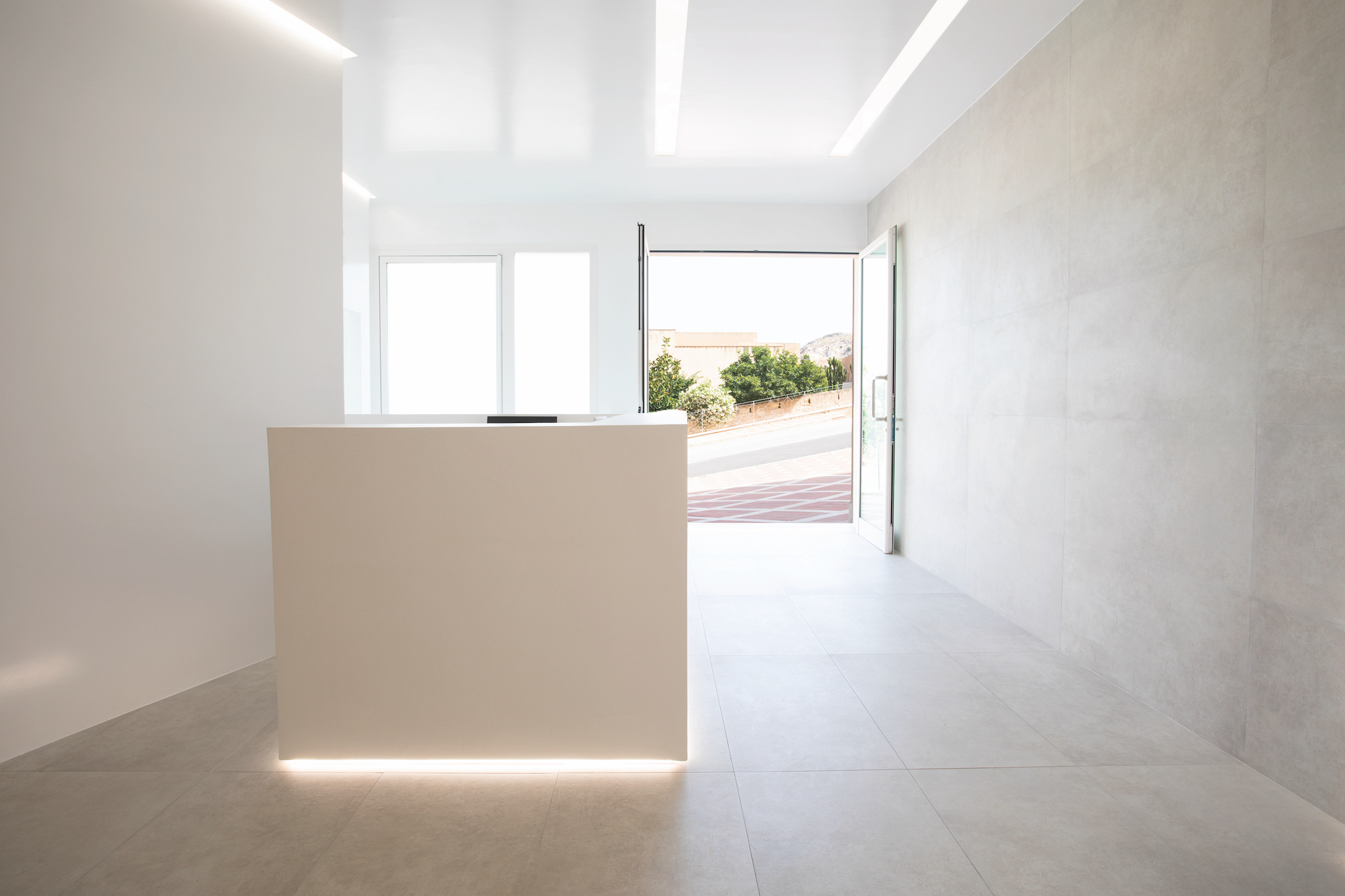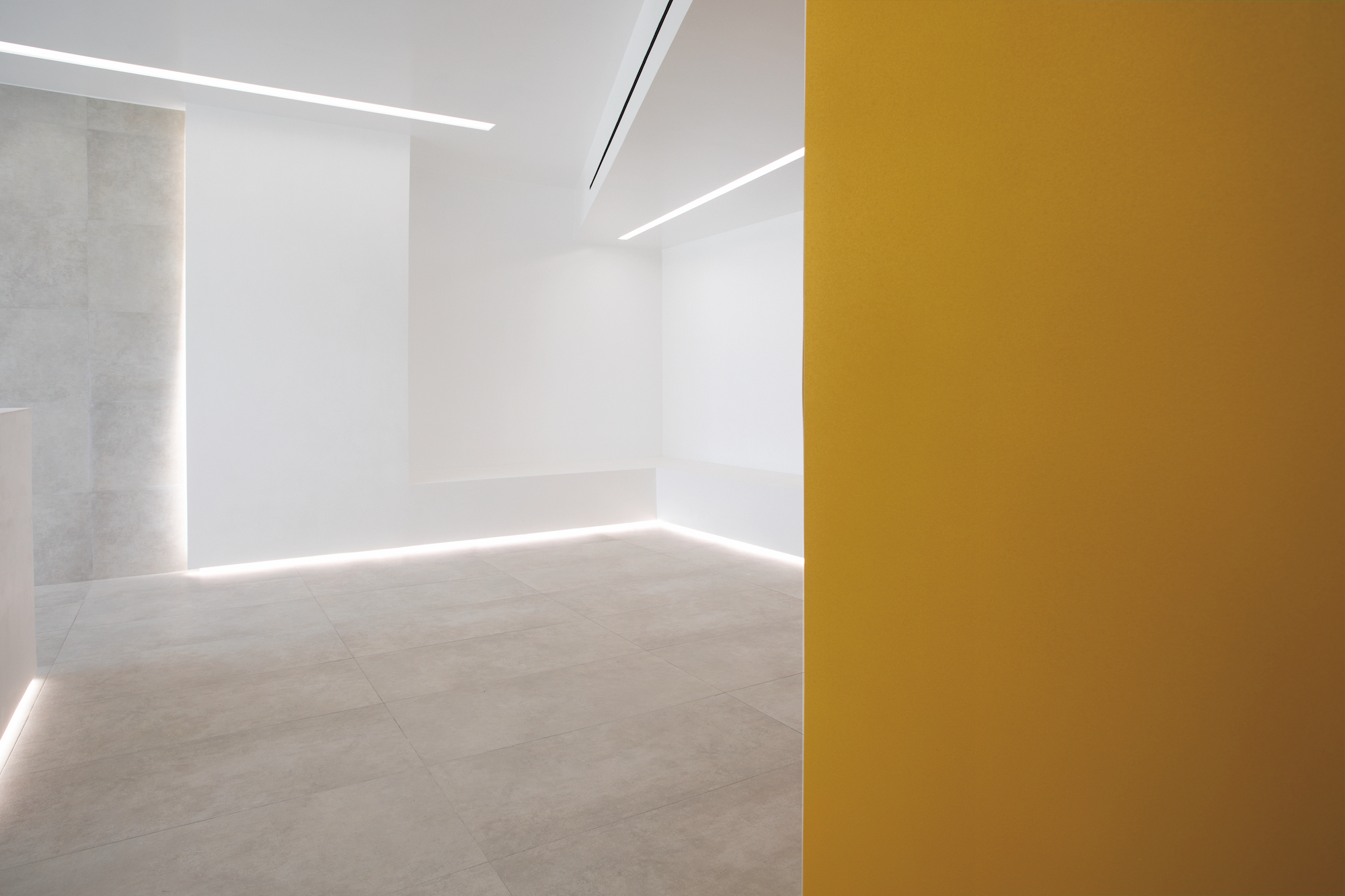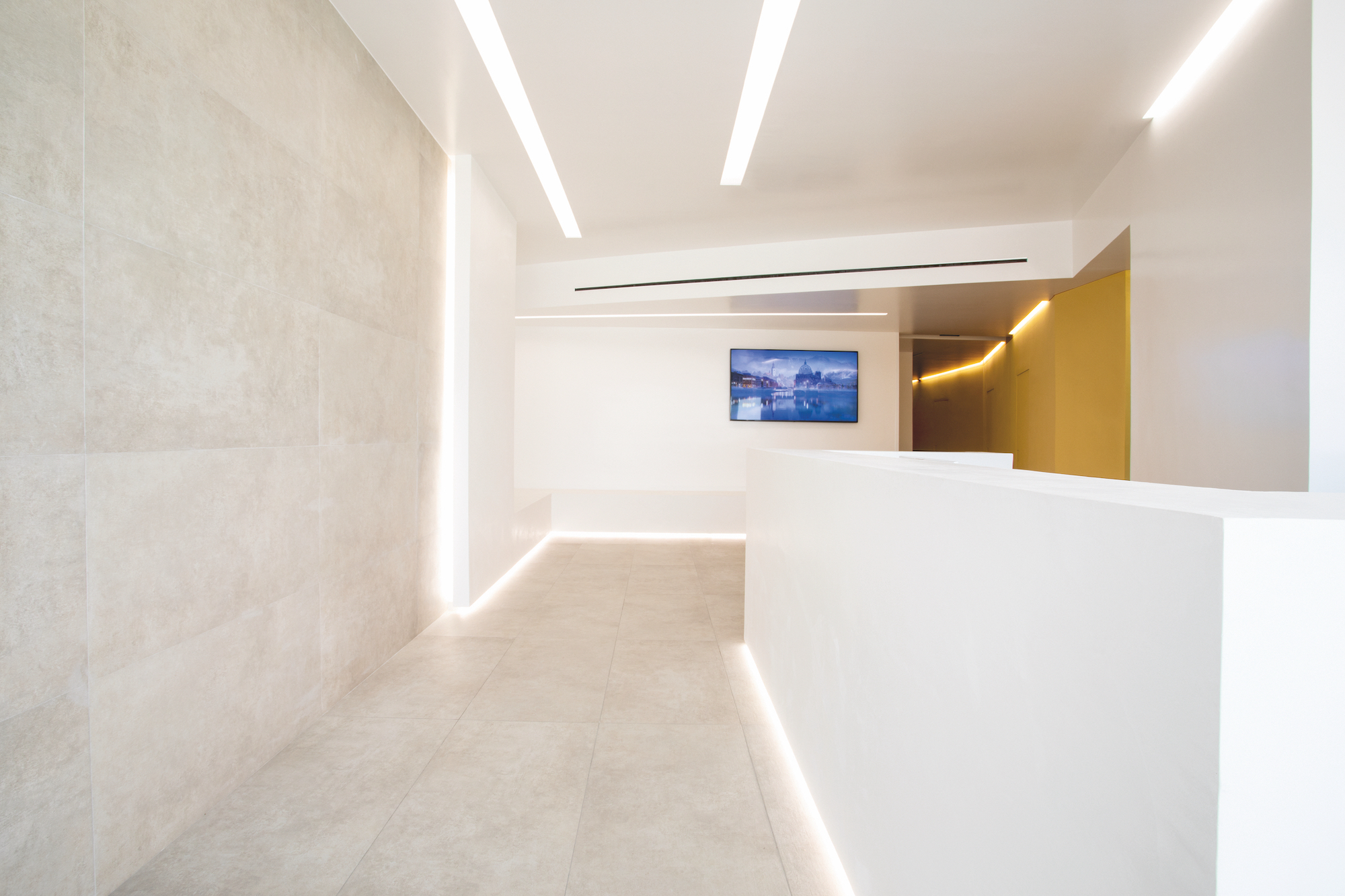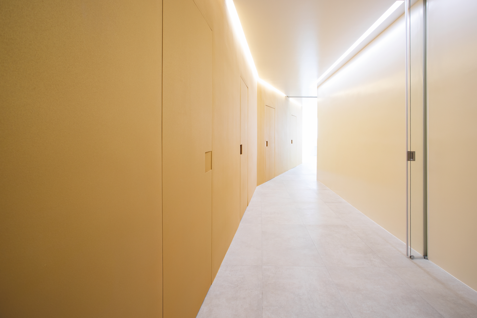 La hall d’ingresso, con il bancone della reception, si affaccia su strada ed è la zona che riceve la maggior parte della luce naturale. Pensata come uno spazio quasi monolitico, con il bancone in cemento, il cartongesso sagomato sia sulla superficie orizzontale del controsoffitto che su quella verticale della zona di attesa, e il rivestimento ceramico posato anche in parete, la hall riceve il riflesso dorato provocato dalla parete segmentata del corridoio, dando vita a un effetto insapettato.