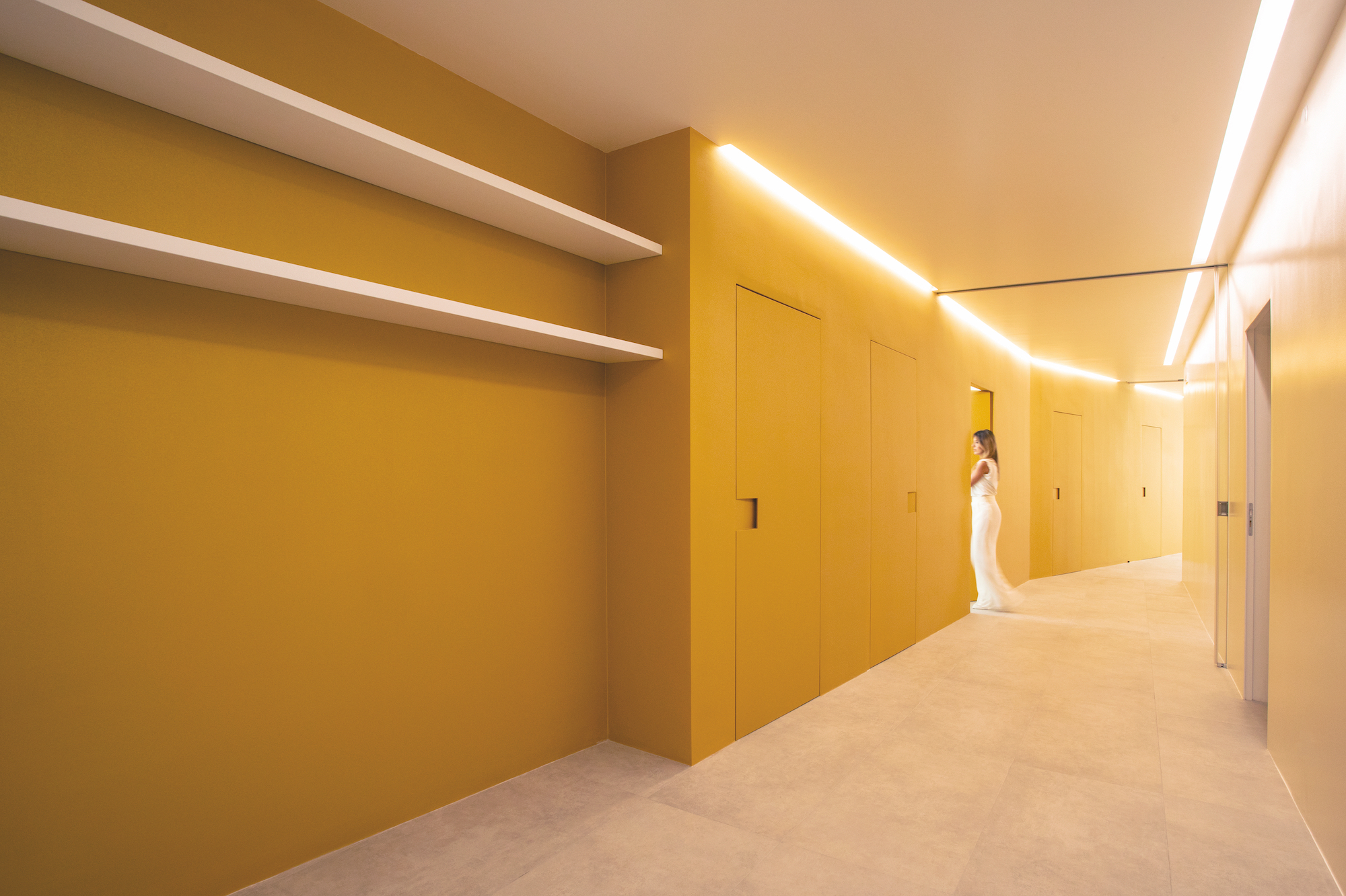 Una parete dorata con porte tagliate a filo, appositamente disegnate dall’architetto, su cui si aprono le stanze di trattamento dello studio e i servizi attinenti: spogliatoi che fungono anche da piccoli magazzini, e i tre servizi.
