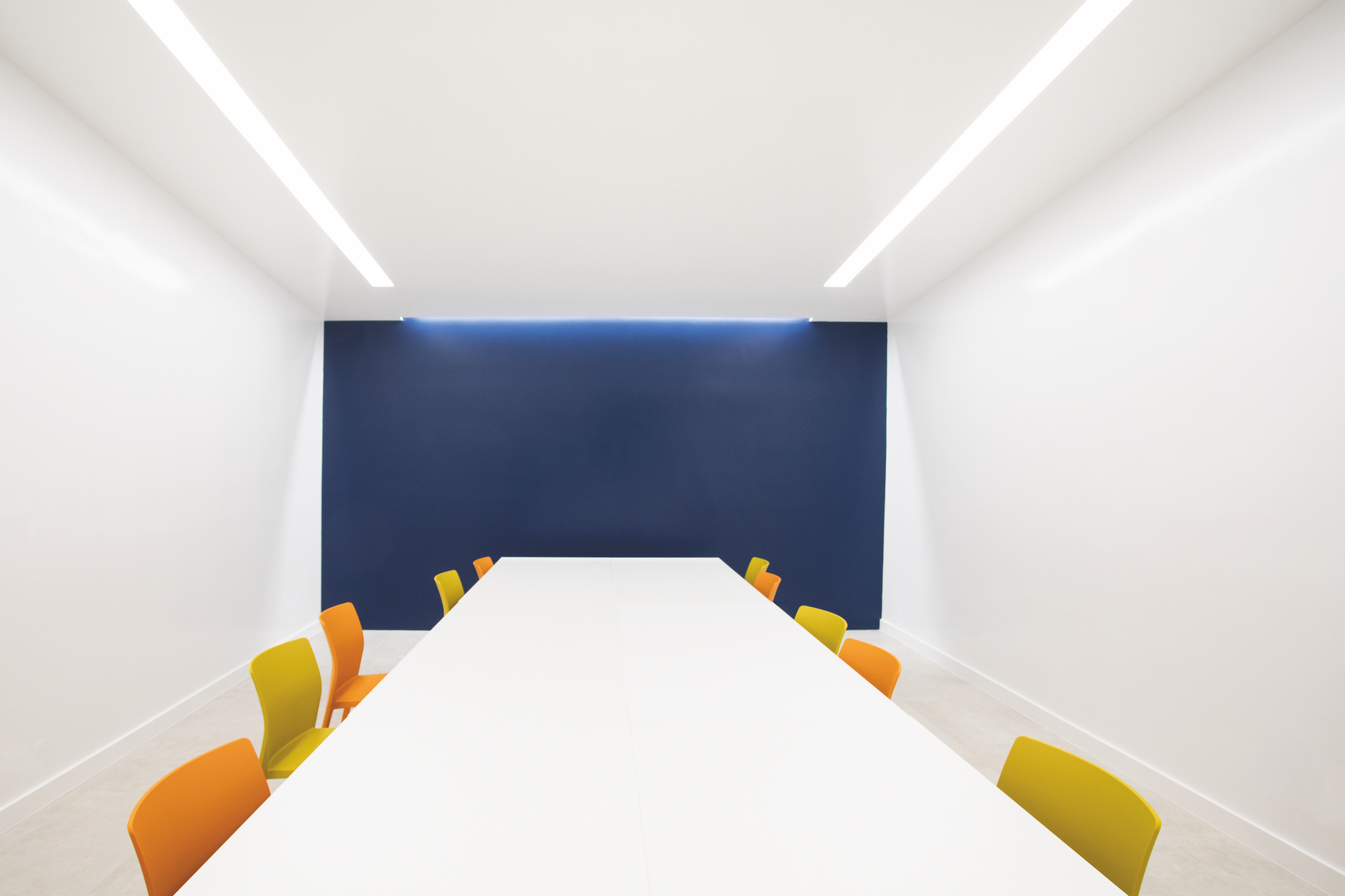 Alla fine del percorso si trova la sala polifunzionale che può, all’occorrenza, trasformarsi in sala conferenze, sala riunioni, caratterizzata da una parete di fondo blu e un controsoffitto inclinato, escamotage che conferisce un effetto prospettico di maggiore profondità all’ambiente.