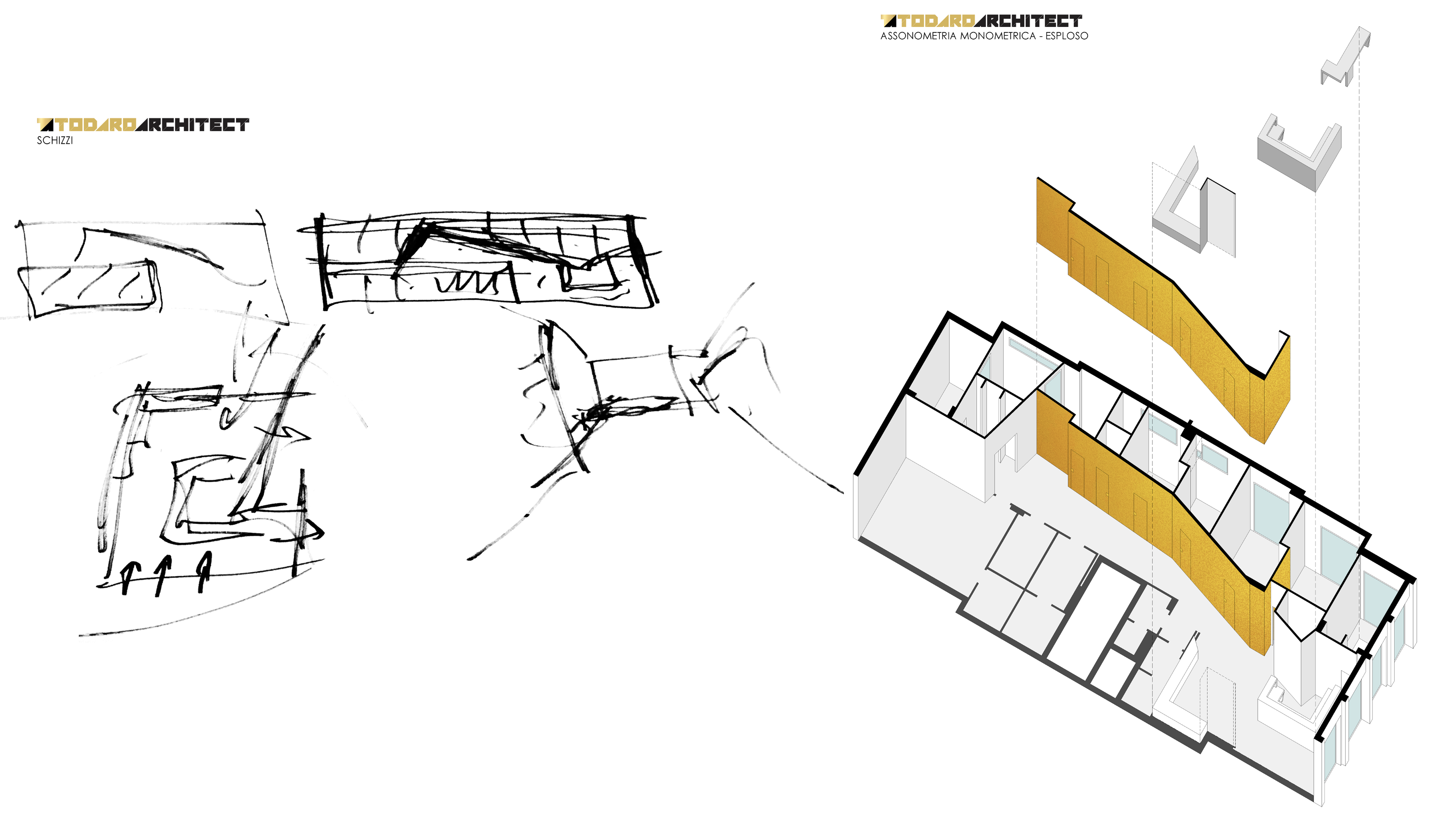 «In questo progetto si crea una frammentazione della scatola attraverso un gioco non solo cromatico ma anche materico e percettivo, dove tutti gli elementi diventano sistema dando qualità allo spazio» Giuseppe Todaro, architetto