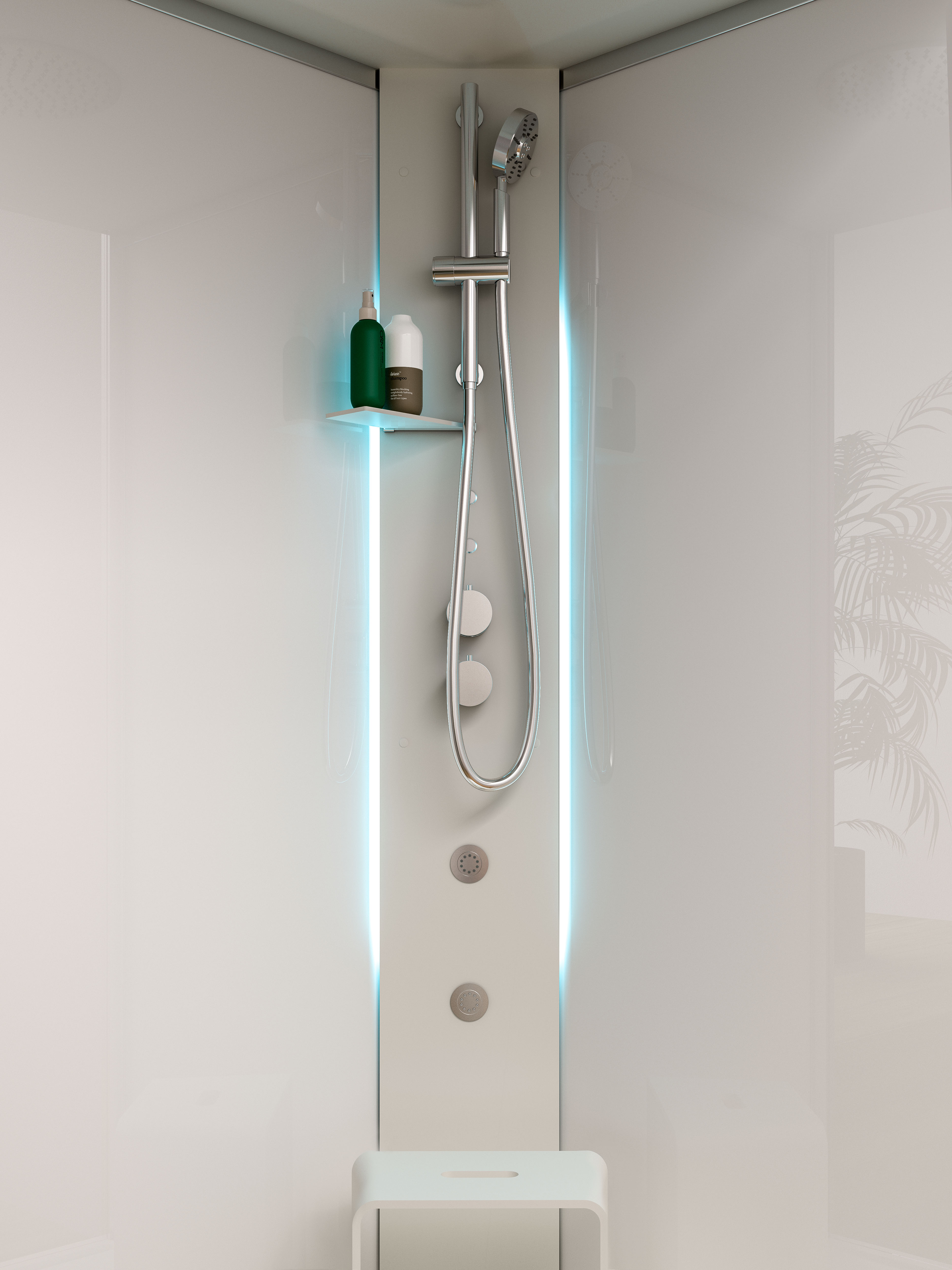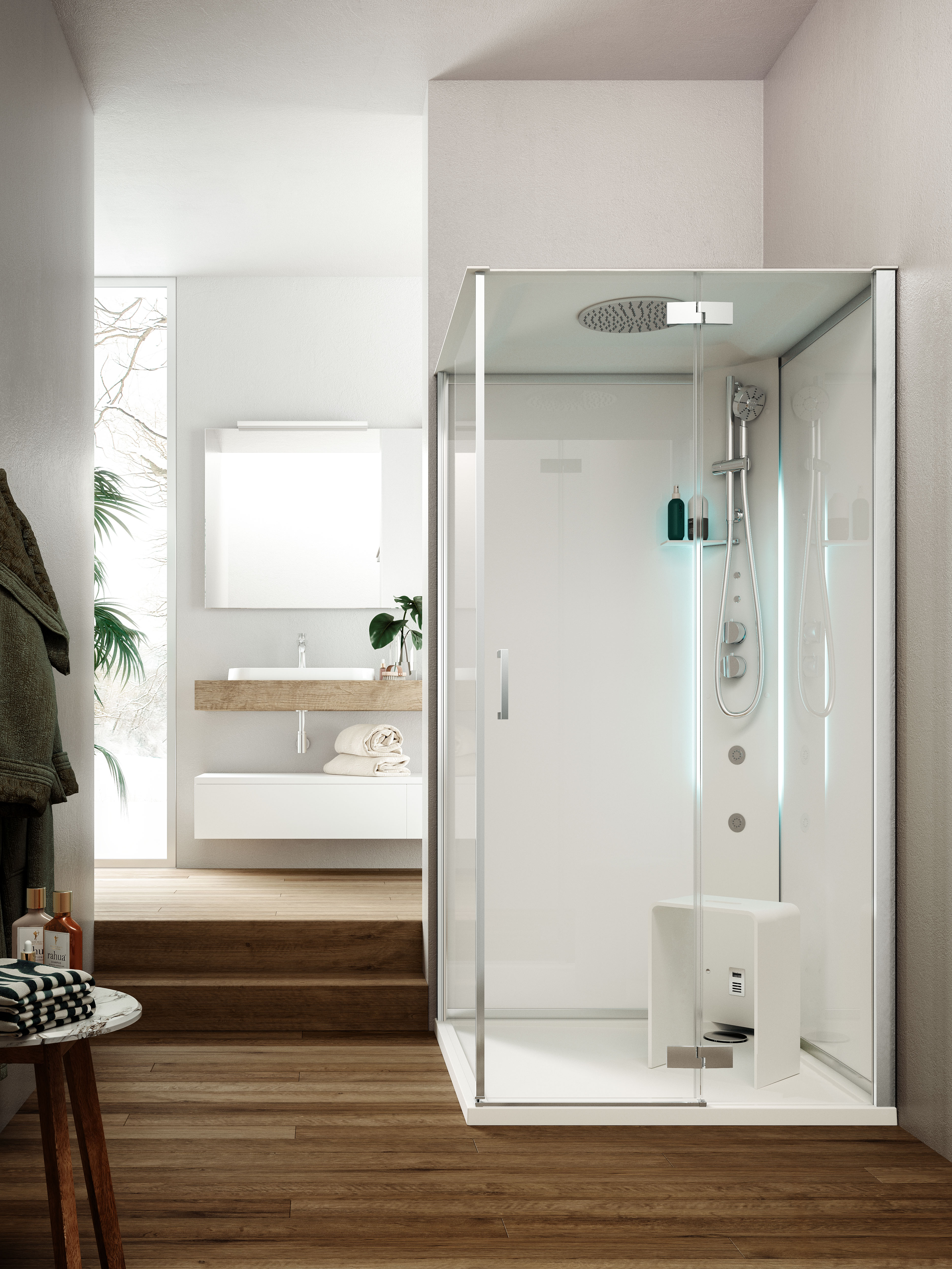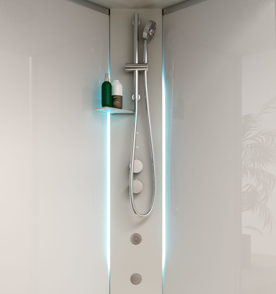 Dotazioni: colonna doccia attrezzata in HardLite con mensola, miscelatore termostatico e doccetta, getti lombari, comandi on/off, cromoterapia a Led, piatto doccia in MineraLite, tettuccio in HardLite con soffione, kit audio bluetooth, generatore di vapore 2,2 kW_2,7 kW e aromadispenser, chiusura porta battente e laterale fisso, cristallo trasparente 6 mm, cristalli a muro serigrafati bianco effetto coprente