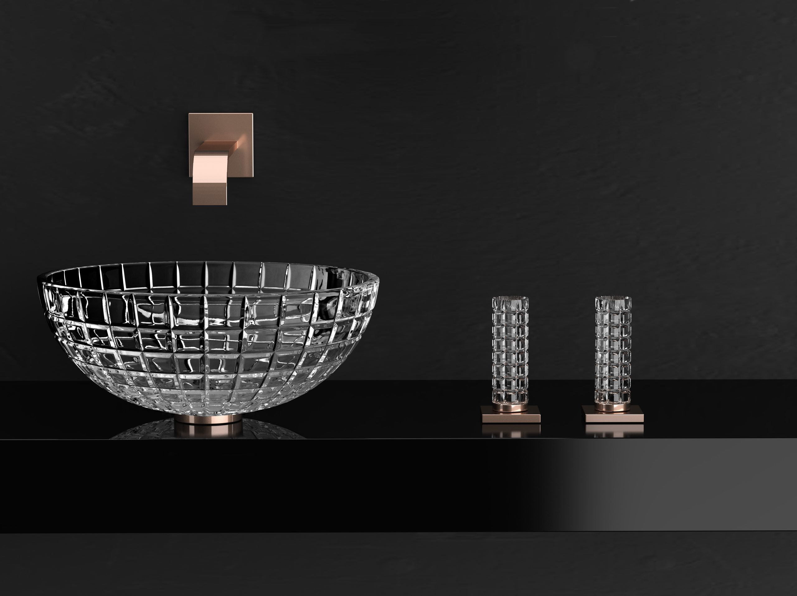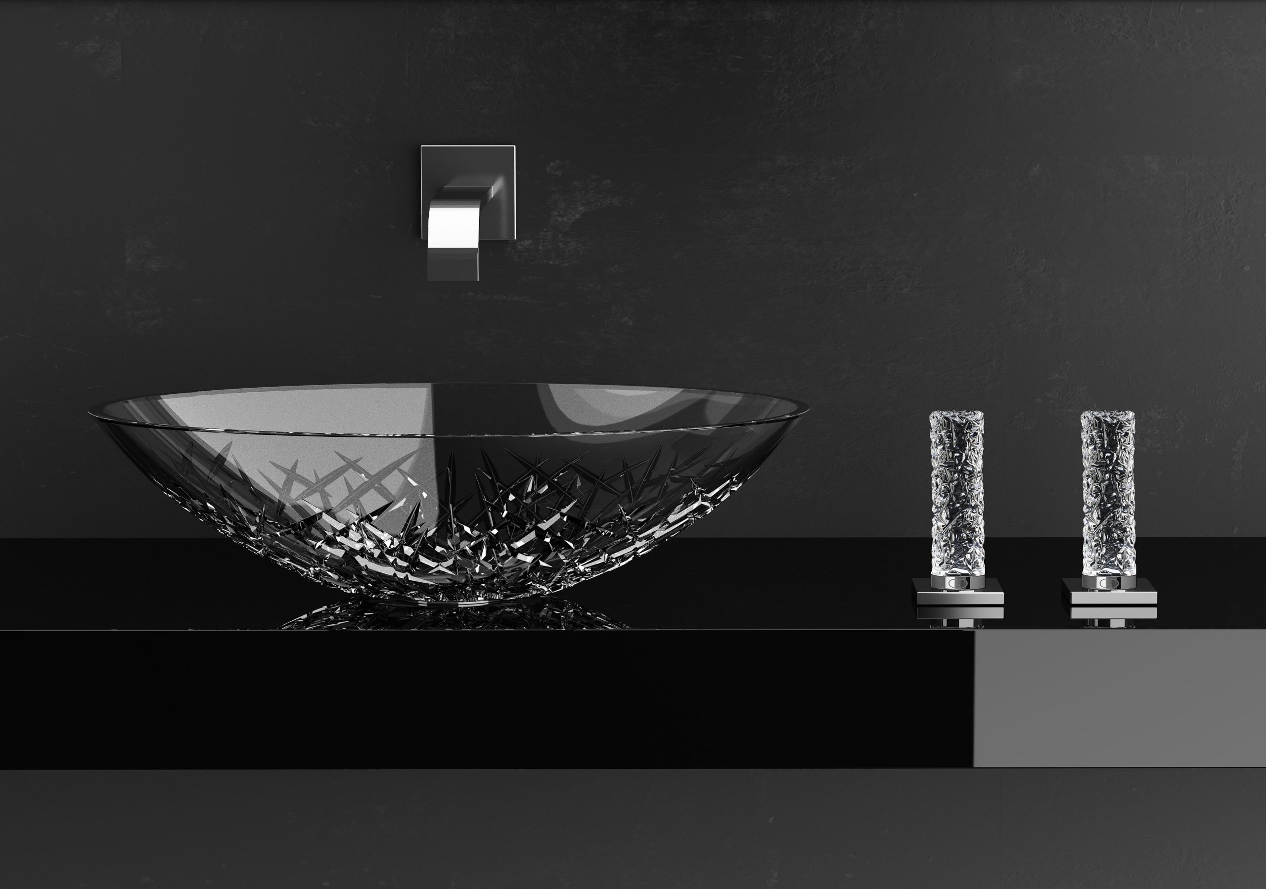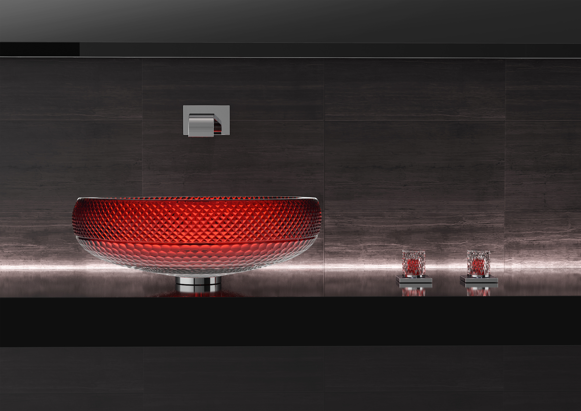 Scenic Ramada, Luxor Round e Ice Oval sono tre lavabi prodotti da Glass Design all’insegna di un lusso raffinato. Nel primo, la ricchezza delle incisioni classiche incontra il design in una simbiosi equilibrata. Lavabo d’appoggio realizzato in cristallo 24% pb, molato con tagli diamante in un esclusivo rosso rubino, si accompagna con le manopole in cristallo Lyric Ramada.