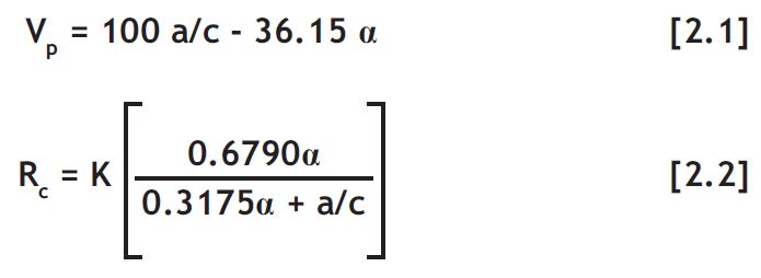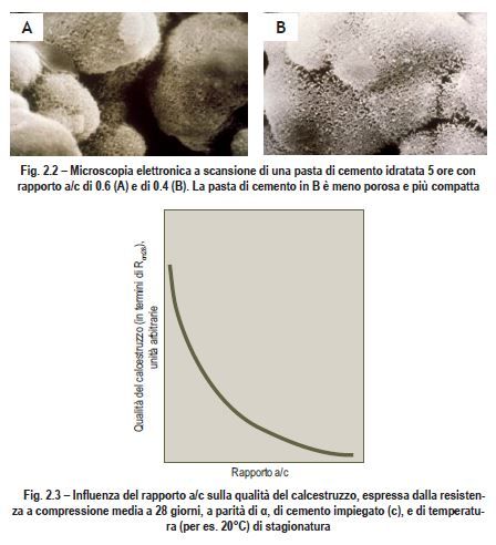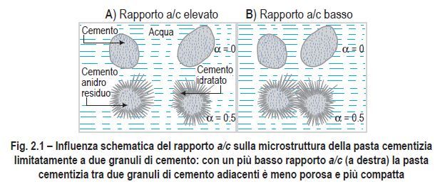 Dalle equazioni [2.1] e [2.2] si deduce immediatamente che, per ridurre la porosità capillare (Vp ↓) ed aumentare la resistenza meccanica (Rc ↑), è necessario aumentare il grado di idratazione del cemento (α ↑) e diminuire il rapporto acqua/cemento (a/c↓):