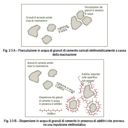 In sostanza, in presenza di additivi le superfici di tutti i granuli di cemento verrebbero ad assumere una carica elettrostatica dello stesso segno (negativa) e pertanto le singole particelle tenderebbero a respingersi anziché ad agglomerarsi.