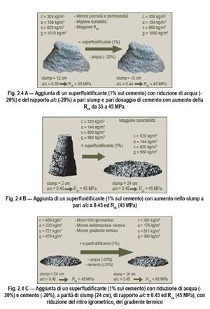 Esiste, infine, anche un terzo metodo di impiego (C) che in pratica è il più diffuso e consiste nell’aggiungere l’additivo riducendo sia l’acqua di impasto che il dosaggio di cemento in modo da mantenere costante il rapporto a/c con i seguenti vantaggi (fig. 2.4 c): riduzione del costo del calcestruzzo perché l’incidenza dell’additivo è minore di quella del cemento; riduzione di tutte le proprietà negative del calcestruzzo legate ad un eccesso di cemento (ritiro igrometrico, gradiente termico provocato dal calore di idratazione) con benefici sulla riduzione del rischio di fessurazione di origine igrometrica o termica.