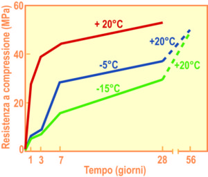 Per esempio, con i primi due additivi è possibile ottenere a 90 giorni la resistenza meccanica richiesta a 28 giorni ancorché la temperatura sia permanentemente a -5°C (3).