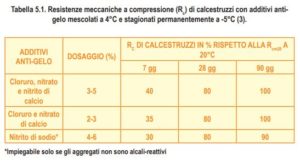 Nella Tabella 5.1 sono mostrate le resistenze del calcestruzzo ottenibili a -5°C espresse come percentuali della resistenza meccanica richiesta a 28 giorni (a 20°C), con l’impiego di tre additivi anti-gelo.