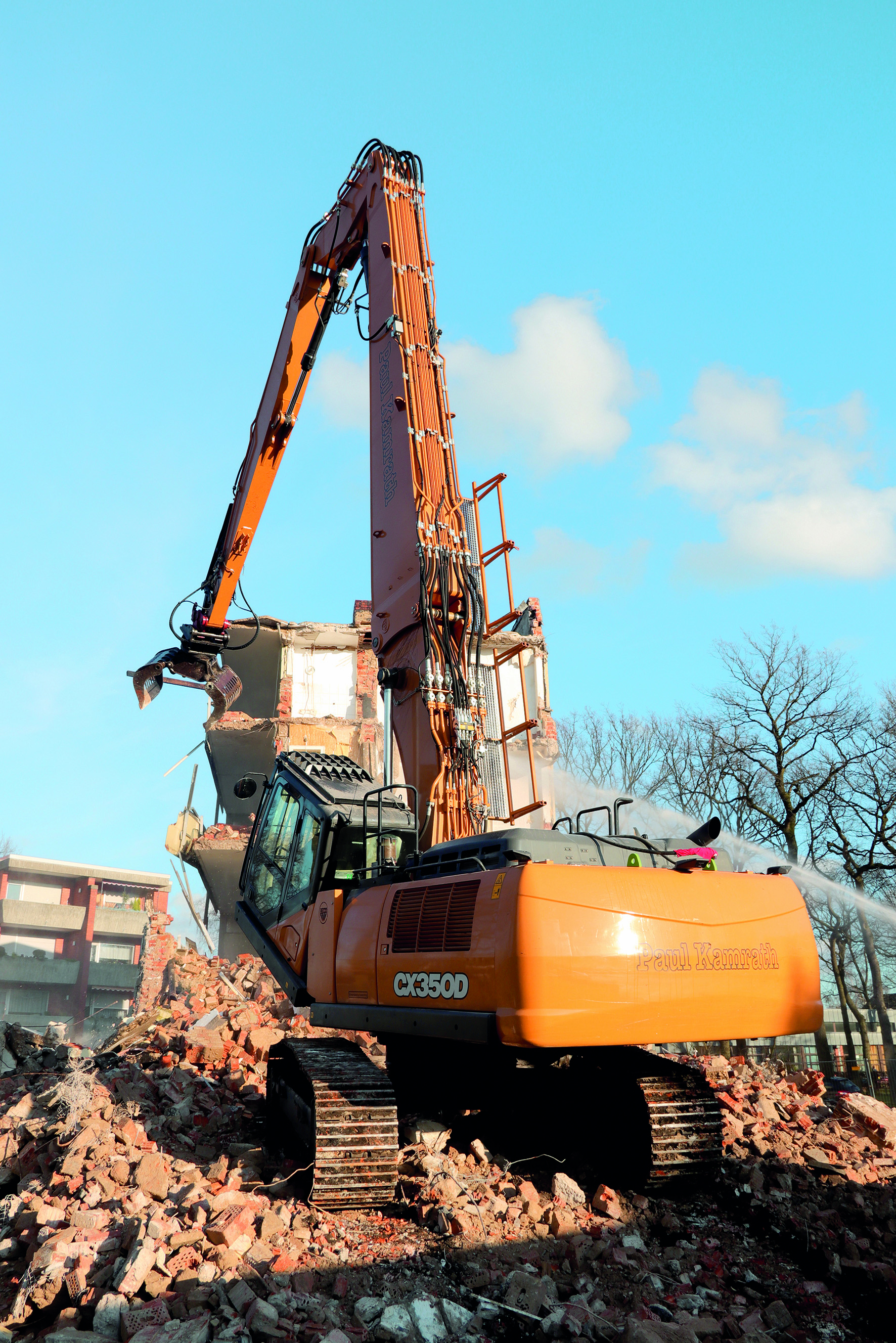 La demolizione di edifici molto alti con escavatori tradizionali presenta spesso dei problemi. L’unico modo per affrontare questa sfida è dotare la macchina di un braccio esteso da 21 metri, come ha fatto di recente l’azienda tedesca Paul Kamrath Ingenieurrückbau con un CX350D.