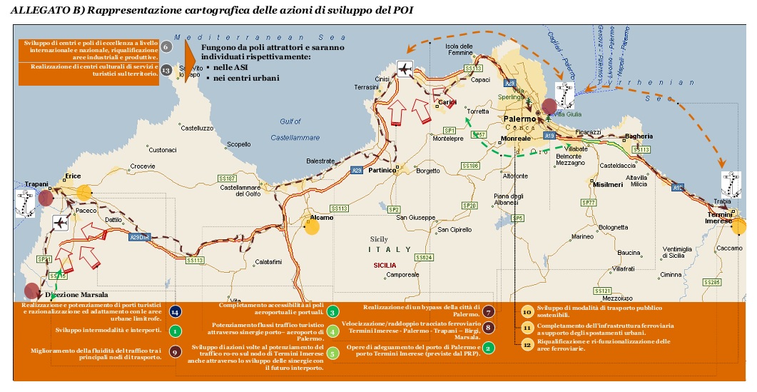 Grazie agli interventi programmati e già approvati, che coinvolgono differenti interlocutori (ad esempio Anas e Rfi), e grazie alle risorse stanziate con delibera Cipe 10/2009, si potrà garantire nell’arco dei prossimi anni una progressiva integrazione funzionale del polo Palermo, Termini Imerese e Trapani con le grandi arterie stradali e ferroviarie, in particolare con il corridoio n. 1 Palermo – Berlino.