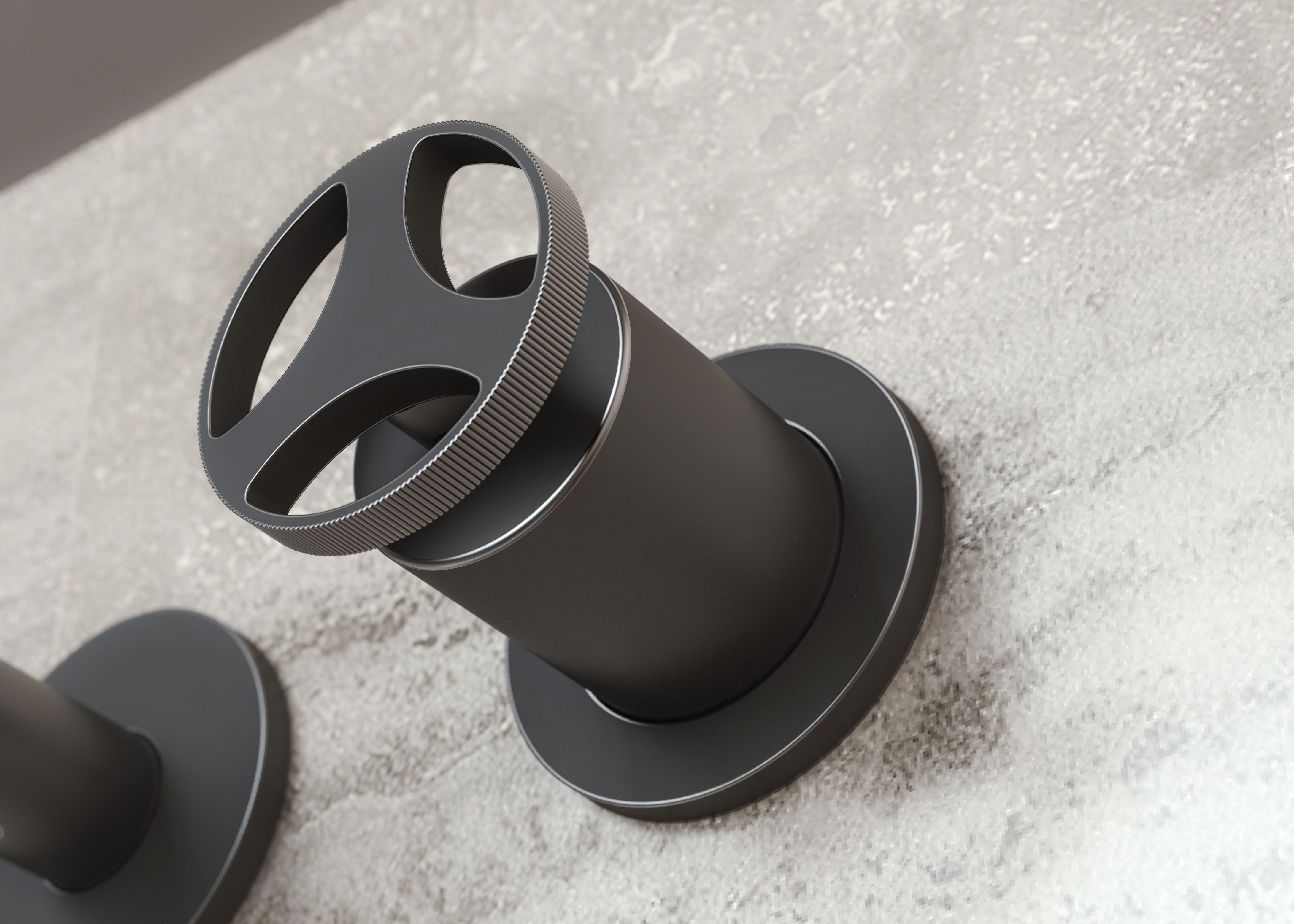 Lo studio di progettazione G+Design ha lavorato molto attentamente sui particolari dell’impugnatura per arrivare ad una soluzione bella, pratica e funzionale: la maniglia è volutamente zigrinata e la superficie è a rilievo per evitare che scivoli quando viene chiusa anche con le mani bagnate o insaponate. La forma ergonomica prevede la possibilità di inserire le dita all’interno della maniglia o di azionare i comandi impugnandoli dall’esterno.